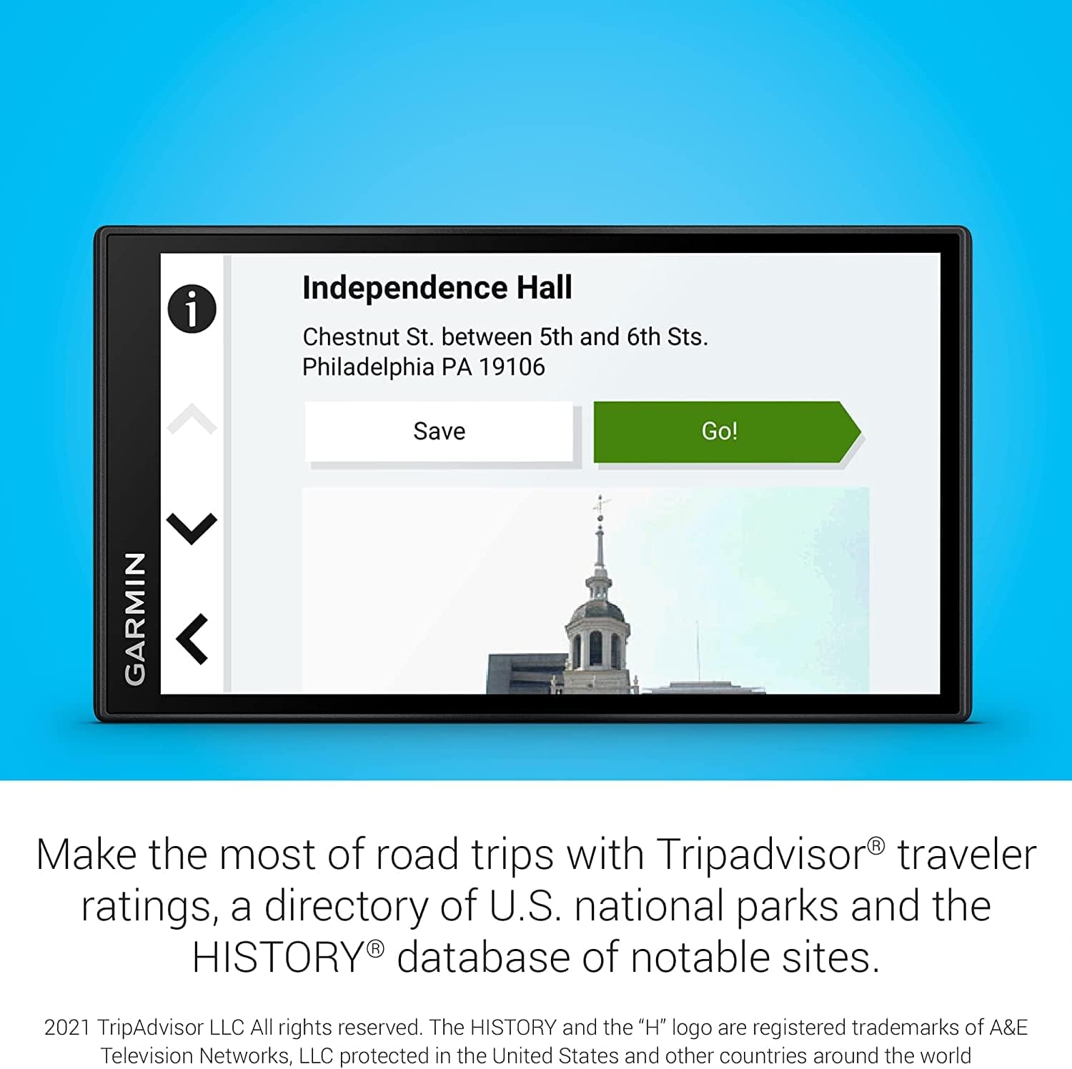 Simplify your drive with the Garmin DriveSmart series of GPS navigators. Use Garmin voice assist to easily find and navigate where you want to go. The crisp 6″ display and map updates of North America show you the way, providing alerts for speed changes and potential hazards ahead. Make the most of road trips with Tripadvisor® traveler ratings, a directory of U.S. national parks and the HISTORY® database of notable sites. Pair with the Garmin Drive™ app on your compatible smartphone for on-screen access to live traffic, fuel prices, parking, weather and traffic cams to help avoid delays and keep you on your way. Features: 6” high-resolution navigator includes map updates of North America Hands-free calling when paired with your compatible smartphone with BLUETOOTH technology and convenient Garmin voice assist lets you ask for directions to places you want to go Road trip–ready features include the HISTORY database of notable sites, a U.S. national parks directory, Tripadvisor traveler ratings and millions of Foursquare POIs Driver alerts for things such as school zones, sharp curves and speed changes help encourage safer driving and increase situational awareness Access live traffic, fuel prices, parking, weather and smart notifications when you pair this navigator with your compatible smartphone running the Garmin Drive app With Alexa Built-in (Drivers should focus on driving and only use this function when safe to do so. Must pair with the Garmin Drive app running on your compatible phone), you can ask to play music, listen to audiobooks, hear the news and more — all while you keep your hands on the wheel and eyes on the road Built-in Wi-Fi connectivity allows easy map and software updates without a computer Included dual USB charger provides an extra charging port for phones, tablets or other electronics, Discover where history happened with the included HISTORY database of notable sites.