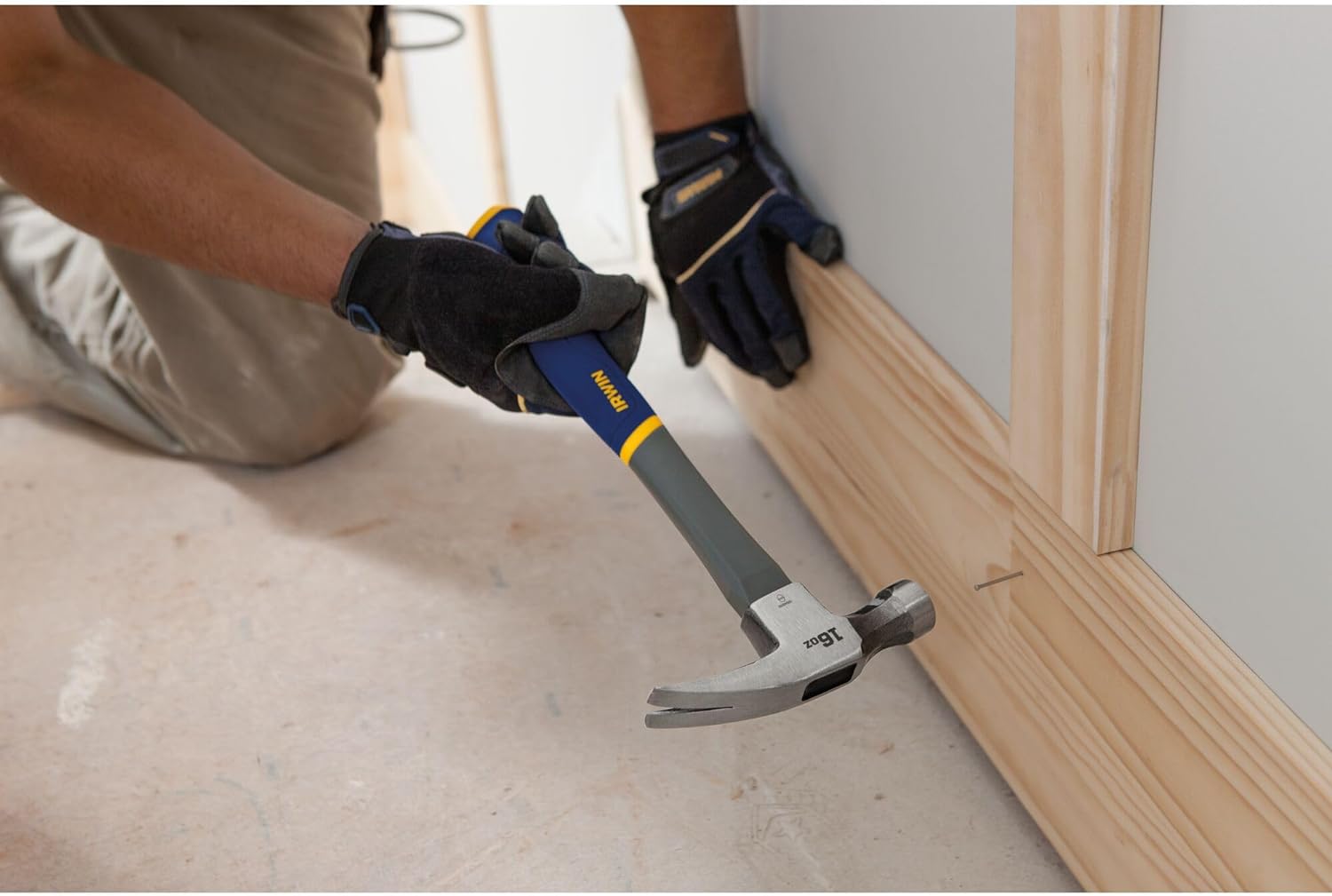 The IRWIN General Purpose Claw Hammer, Fiberglass, 16 oz., combines the strength of a solid forged steel head with the comfort of a custom designed Pro-Touch Grip to create one of the best hammers ever built. It features a smooth face to prevent surface marks and a rip claw for nail removal and prying applications. Its hybrid handle design offers a rounded grip for more comfort, a curved base to prevent slippage and a hardened end cap for maximum durability.