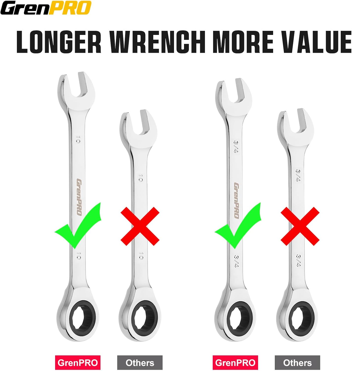 Premium Material:Wrenches are made from durable chrome vanadium steel, additional mirror finish improves the corrosion resistance of the surface and effectively prolong the service life. GrenPRO 22-Piece ratcheting combination wrench set makes emergency repairs a breeze