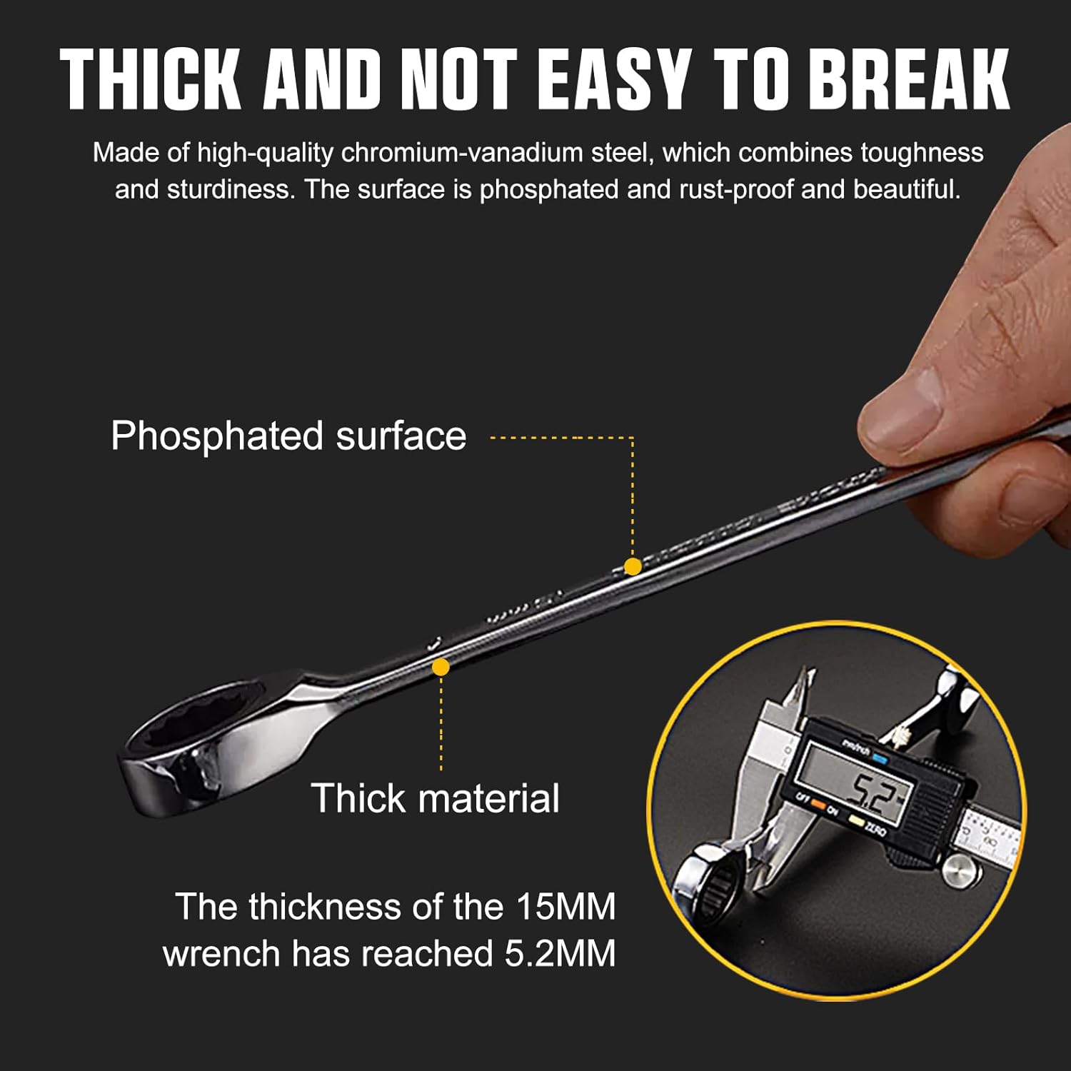 Easy Access,Storage:Ratcheting wrench set comes with a durable Oxford cloth storage bag.The size of each wrench is printed on the tool roll up pouch for easy organization and storage. The model number is embedded in the wrench, which is clearly visible after long-term use and will not wear out. Portable handheld tool bag effectively improves your work efficiency in the long term