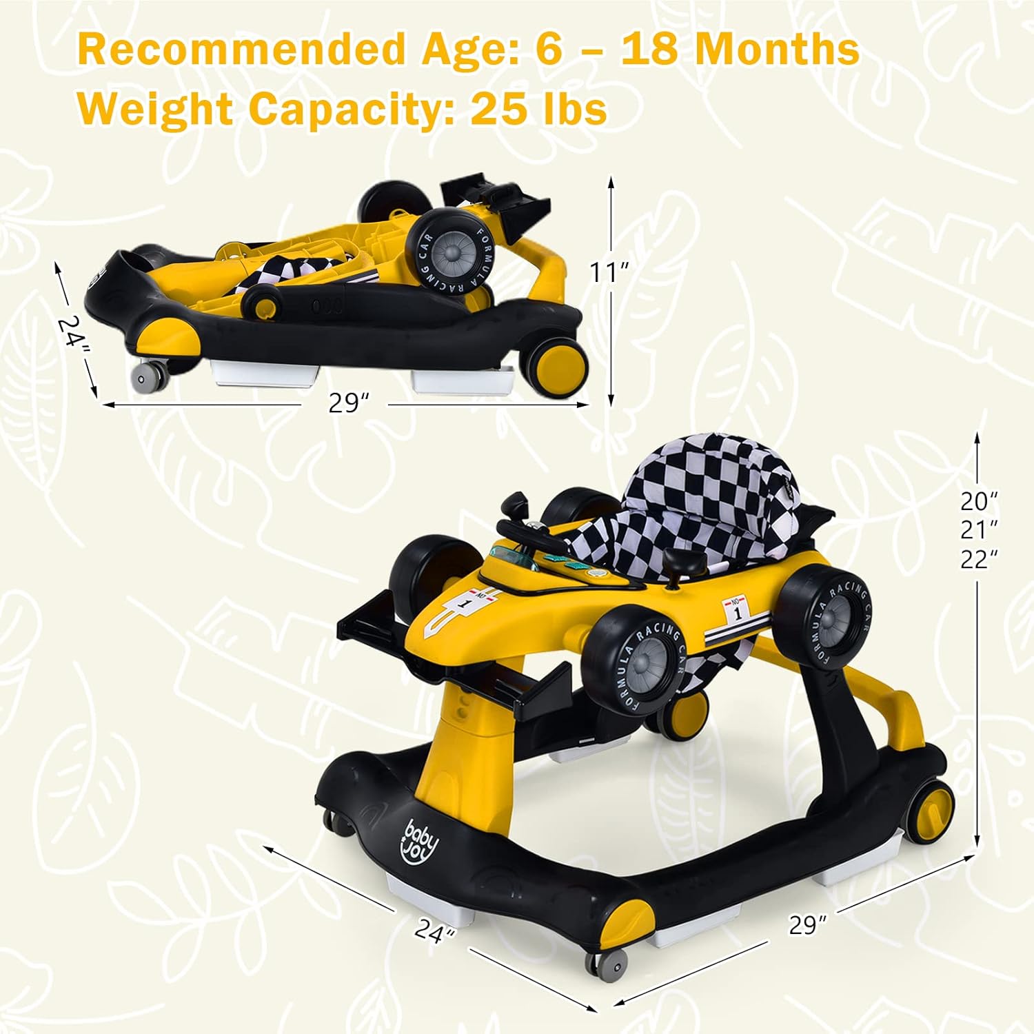 【Fun & Interactive Activity Center】 BABY JOY 4-in-1 Racing Car Walker takes your baby from stumbling steps to the fast lane of growth and witness them become winners on their own life path. The steering wheel, shifter, rear-view mirrors and light buttons satisfy your baby’s curiosity for exploration and early learning. And the music keeps the fun going. Requires 2 AA batteries (not included).