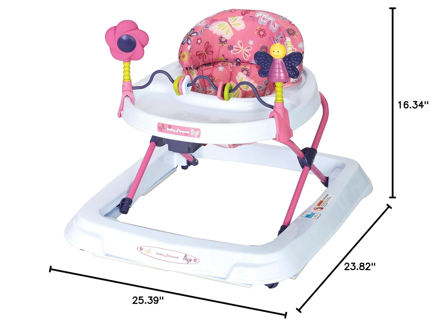 The Emily Baby Trend Walker is designed for comfort and with your baby’s needs in mind. The walker is a breeze to set up, clean and fold, and it’s easy and fun for your baby to use. Along with the multi-directional wheels that offer freedom of movement, the extra-wide base provides superior support and stability so your baby will enjoy playing and moving about. The Baby Trend walker has a large surround tray and removable toy bar. The Emily Baby Trend Walker also features a three-position height adjustable and high-back padded seat for added comfort. 0 to 12 Months, 12 to 24 Months. Do not machine wash.