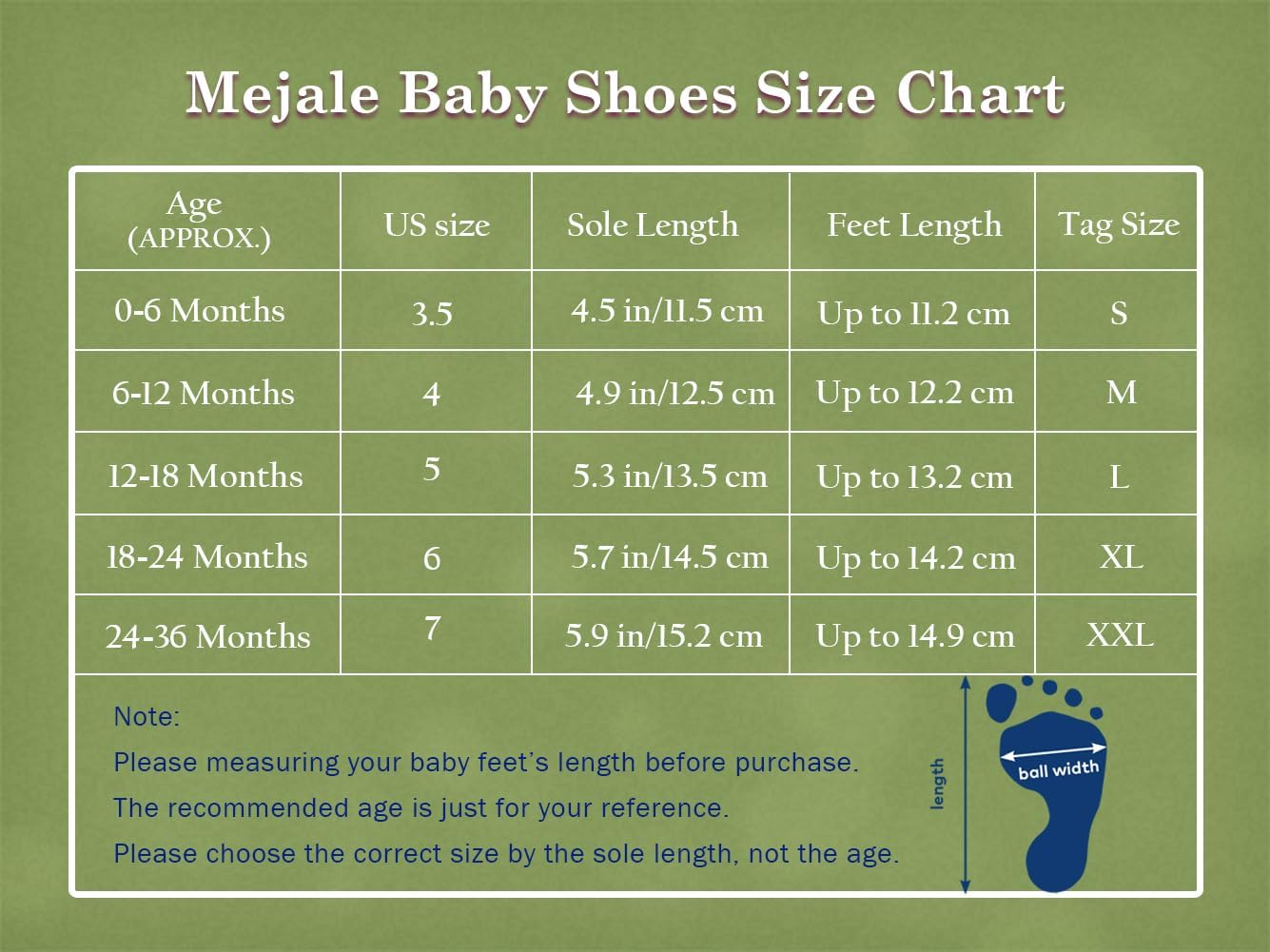 If your baby feet is 12cm long, please choose the shoes at 0.7cm longer, because baby feet need room to grow into.