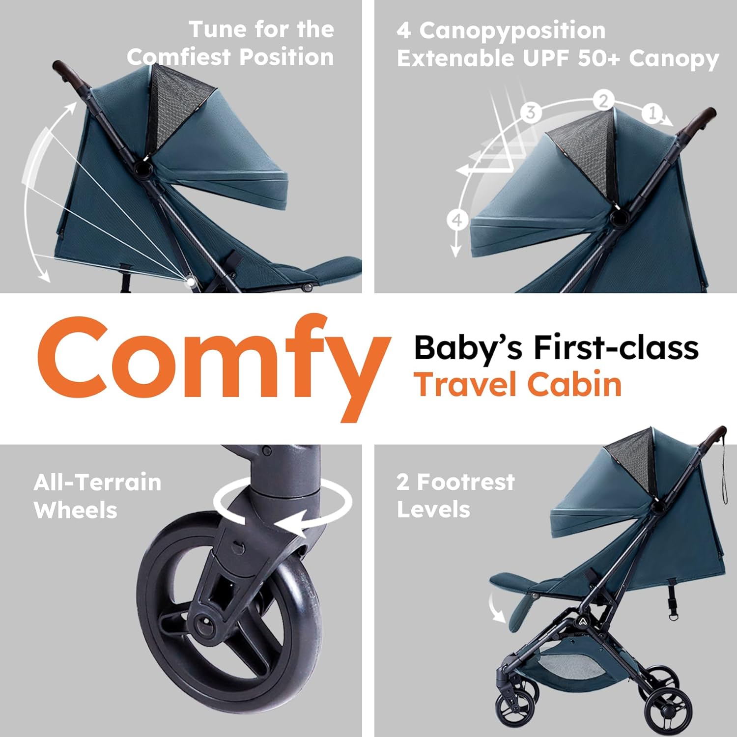 Sun Protection and Comfort: Your child’s comfort and safety are our top priorities. The Ultra Air Stroller features a UV-protective canopy that shields your little one from harmful sun rays, providing a cool and shaded haven for them to relax in. The adjustable UPF 50+ canopy can be easily positioned to cater to different sun angles, allowing you to create the perfect shady spot as you explore outdoor locales.