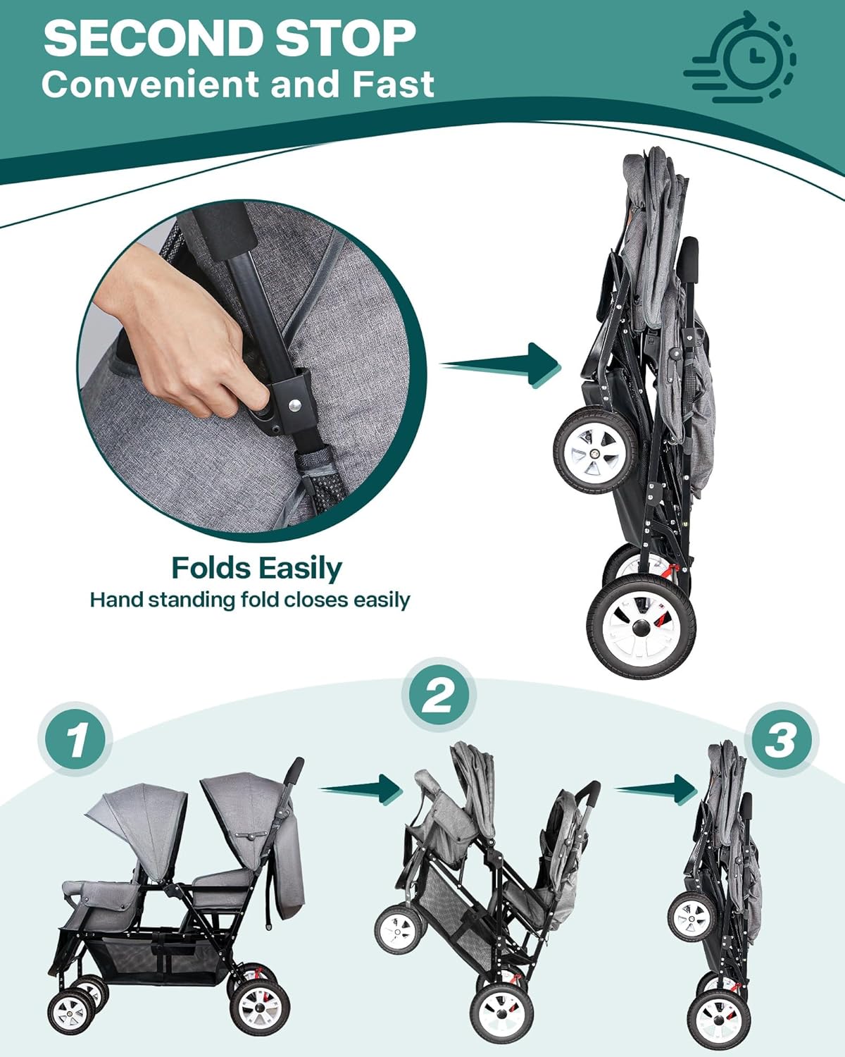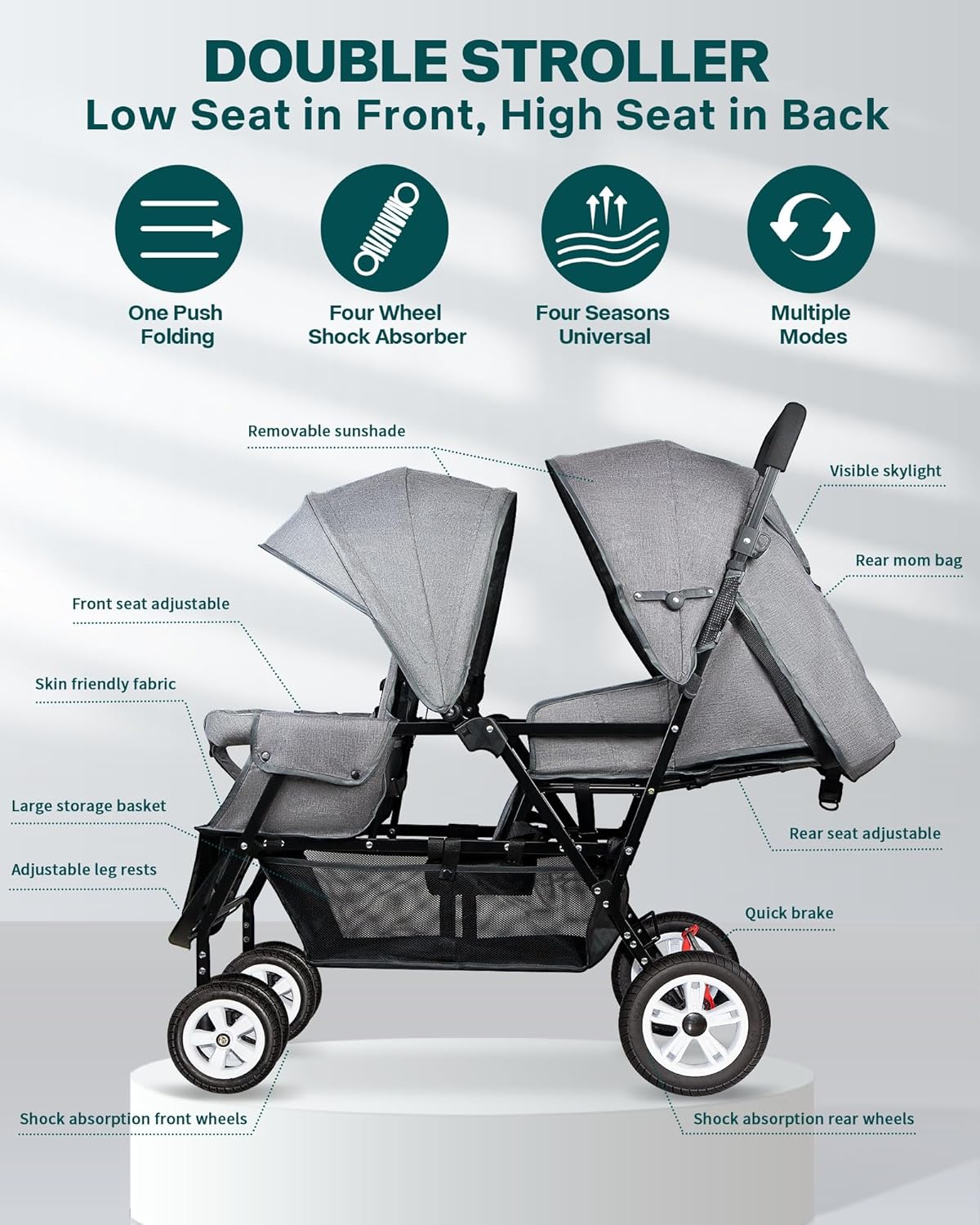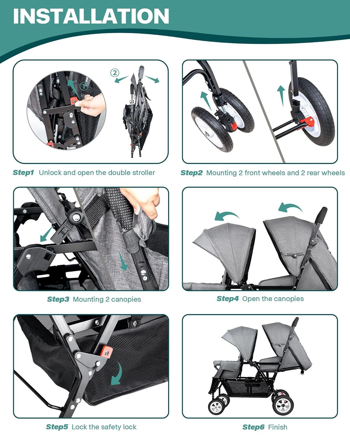 Easy Storage & Adjustment – This double tandem stroller is designed in a more scientific way, easy to fold and store, you can easily transport and storage, the footrest can be adjusted up and down, and can lock the front swivel wheels, providing you with excellent control; there is an enlarged basket under the stroller, so you can easily put things and provide excellent convenience for you to go out.