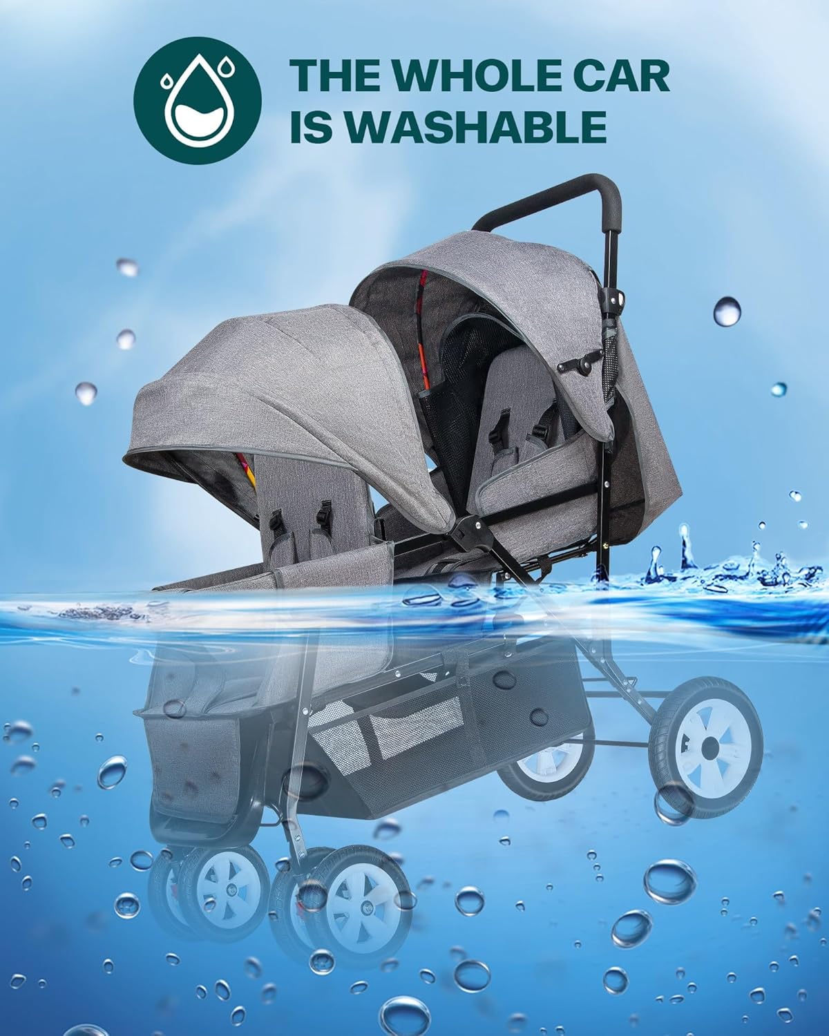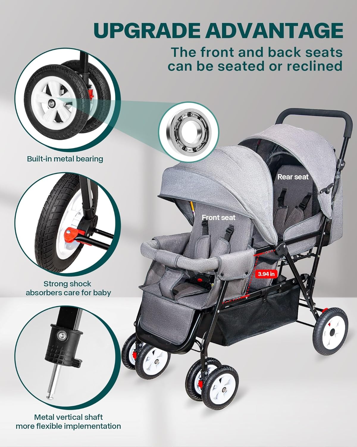 Upgrade Design to Make Everything More Confident – This foldable stroller is designed for families with 2 babies, with a tandem design, more scientific, front and rear is a high and low seat, the front seat – rear seat can sit and lie down, and lengthened by 4inch, the front seat can carry up to 50 pounds, the rear seat can carry up to 40 pounds, with two independent awning and footrest recliner seat, dedicated to making babies more comfortable.