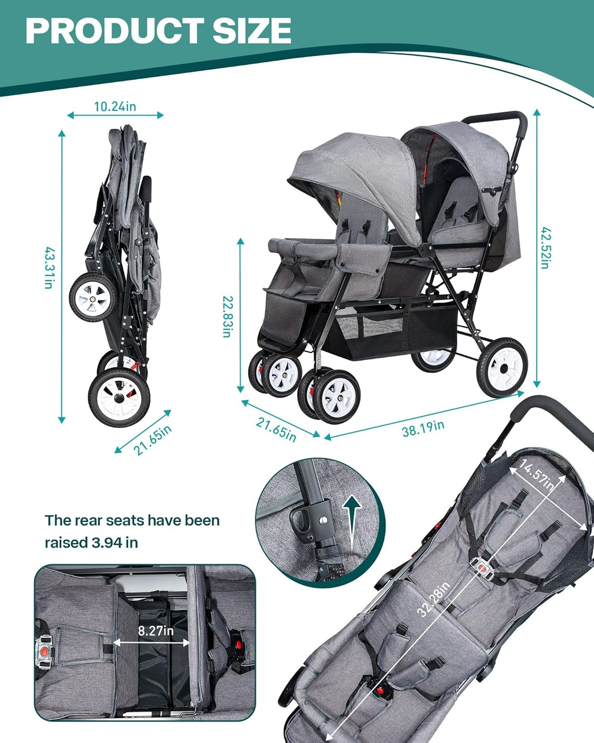 Size & High Quality – This twin stroller unfolded size: 42.25(H)*38.19(L)*21.65inch(W) , folded: 10.24(W)*43.31inch(L) and weighs just no more than 22 pounds. And made of healthy and environmentally friendly materials, with excellent durability and sturdiness, breathable, will not hurt the baby’s delicate skin, more friendly. If you have any questions, we provide 24-hour online after-sales service.