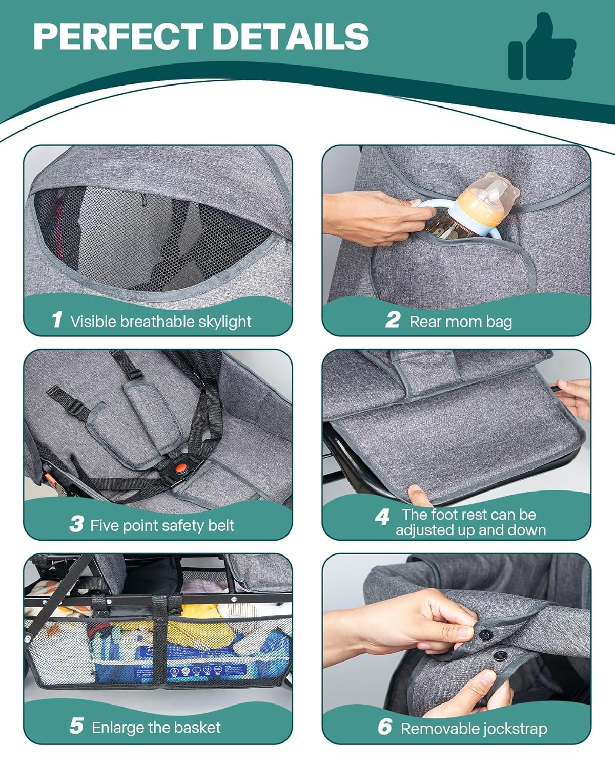 Excellent Handling & Safety – Even if the mother is alone, this foldable double seat tandem stroller can be pushed well and control the trip perfectly. And with a visible breathable skylight, the baby will not feel stuffy, can breathe fresh air and communicate with the outside world and mother well; five-point safety belt greatly increases the safety, not easy to fall; the back has a small pocket can be loaded with bottles and other things.