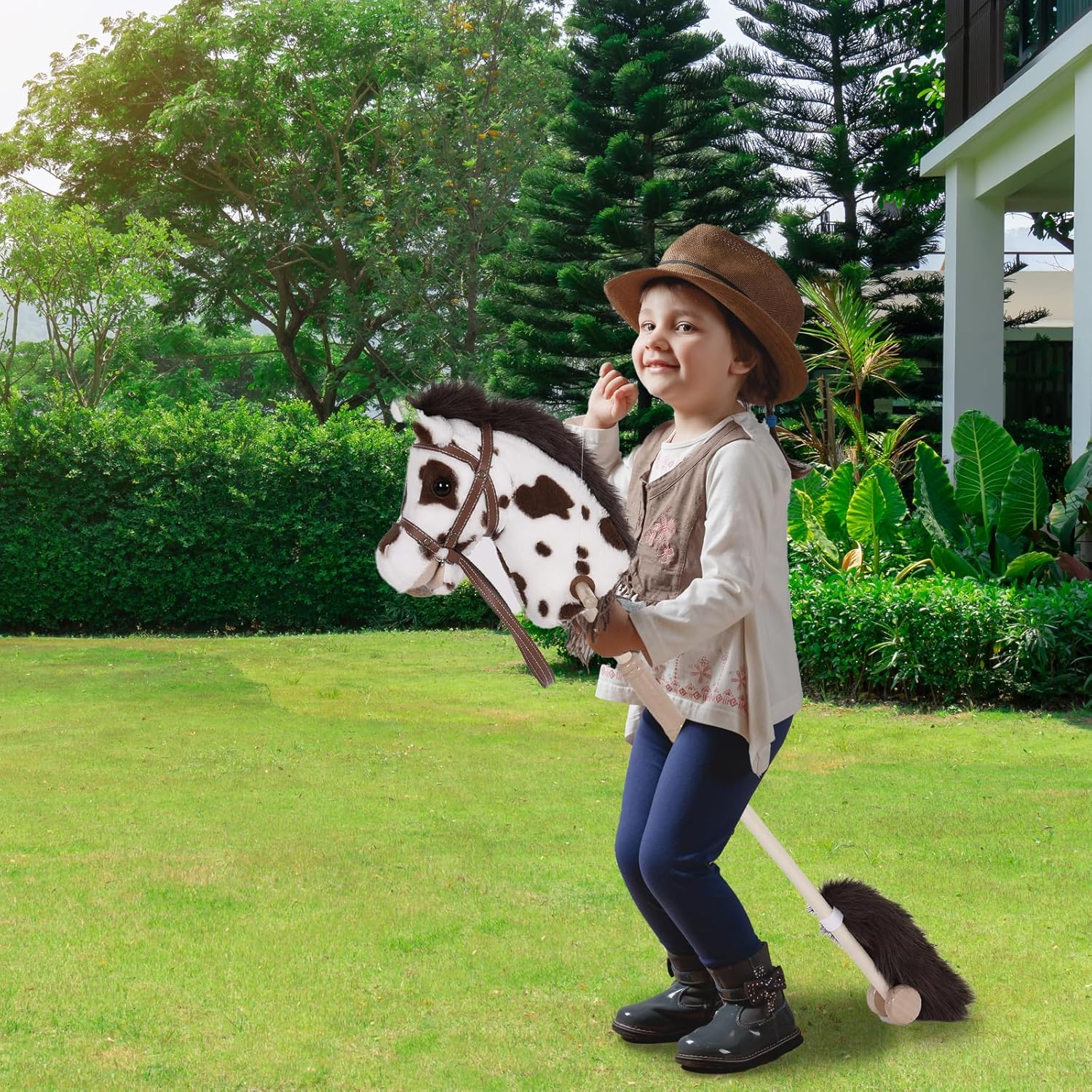 Developing Imagination: PLYFOU stick horse toy features an cute design that will captivate children; After installing batteries, simply press the left ear to hear realistic horse neighs and hoof sounds, providing kids with an authentic riding experience