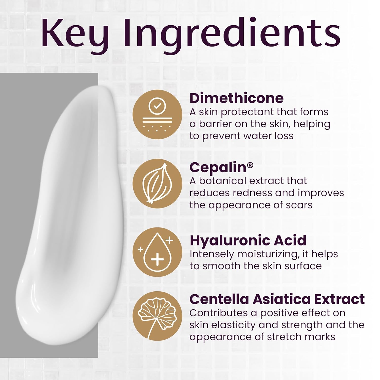 INTENSIVE CREAM FORMULA: With Cepalin botanical extract, Hyaluronic Acid and Centella asiatica extract to moisturize, nourish the skin and visibly reduce stretch marks