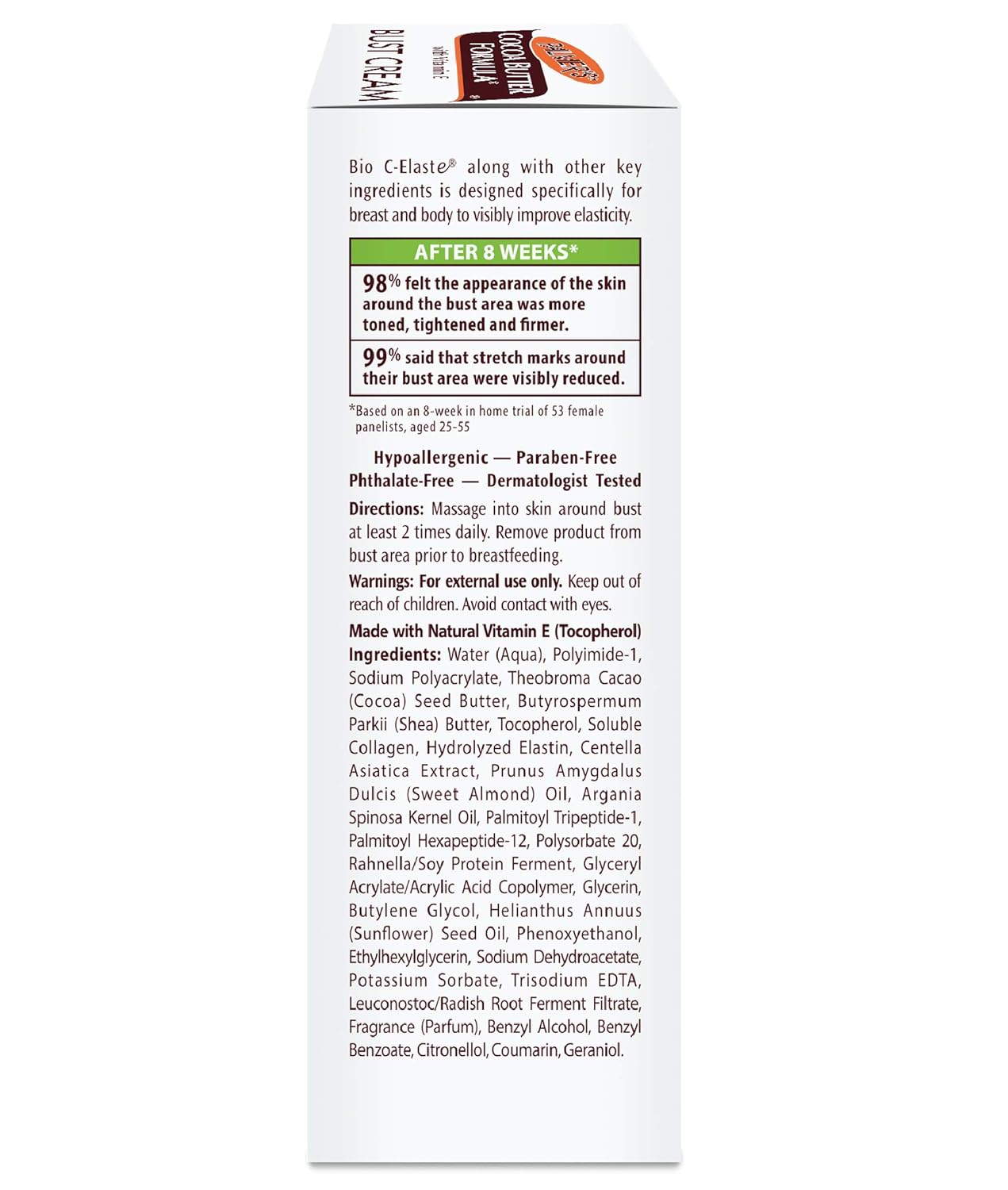 Palmer’s Cocoa Butter Formula Bust Cream is a specially formulated cream that smoothes on like a gel. It will firm and tone your bust area even after pregnancy and weight loss. Made with a unique blend of pure Cocoa Butter, Shea Butter and Vitamin E, to maximize your skin’s moisturization, while Collagen, Elastin and other proven ingredients help support the skin around the bust area and increase tone and firmness.