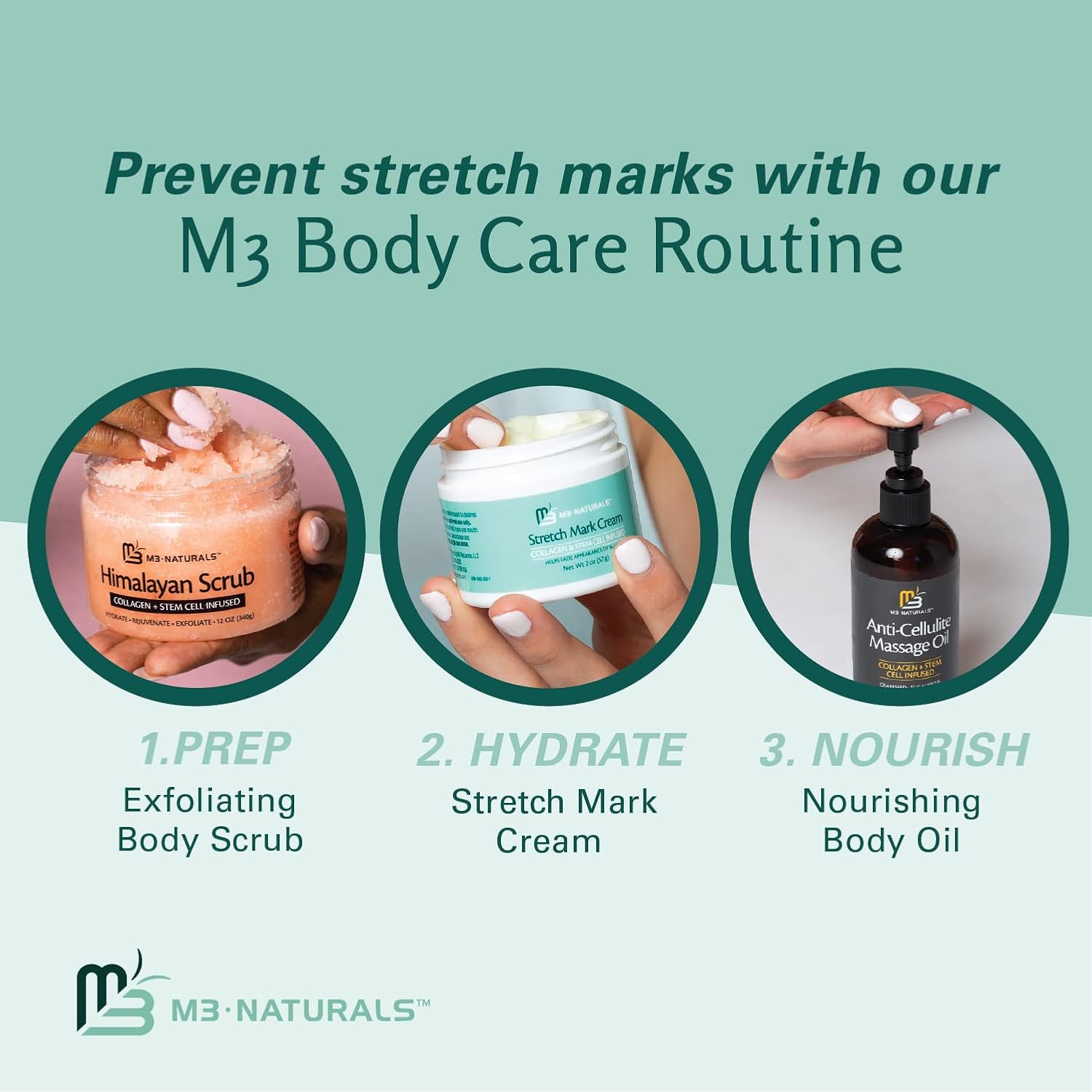 M3 Naturals Stretch Mark Cream! Collagen & Stem Cell Infused to help fade the appearance of scars and marks. Help repair skin damage and scars from pregnancy, surgery, injury, acne, C-section, aging, and more. Firm and moisturize with our favorite pregnancy must-have.