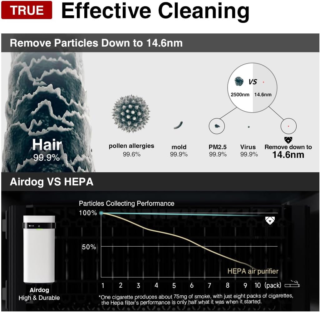 Medical Grade Active Purification With a subversive high-pressure ion air filter, the X5 air purifier terminates all harmful particles, rather than just collecting, by destroying their function. The TPA washable filter of the Airdog X5 air purifier can filter 99.9% of particles down to 0.0146μm, while HEPA filters only handle particles above 0.3μm. Compared with the normal HEPA filter, the TPA filter is up to 20X more effective.
