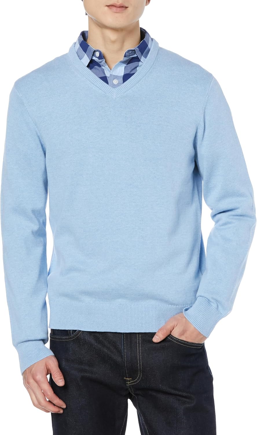 An Amazon Brand – This classic V-neck sweater features ribbing on the collar, hem, and cuffs to keep you warm
