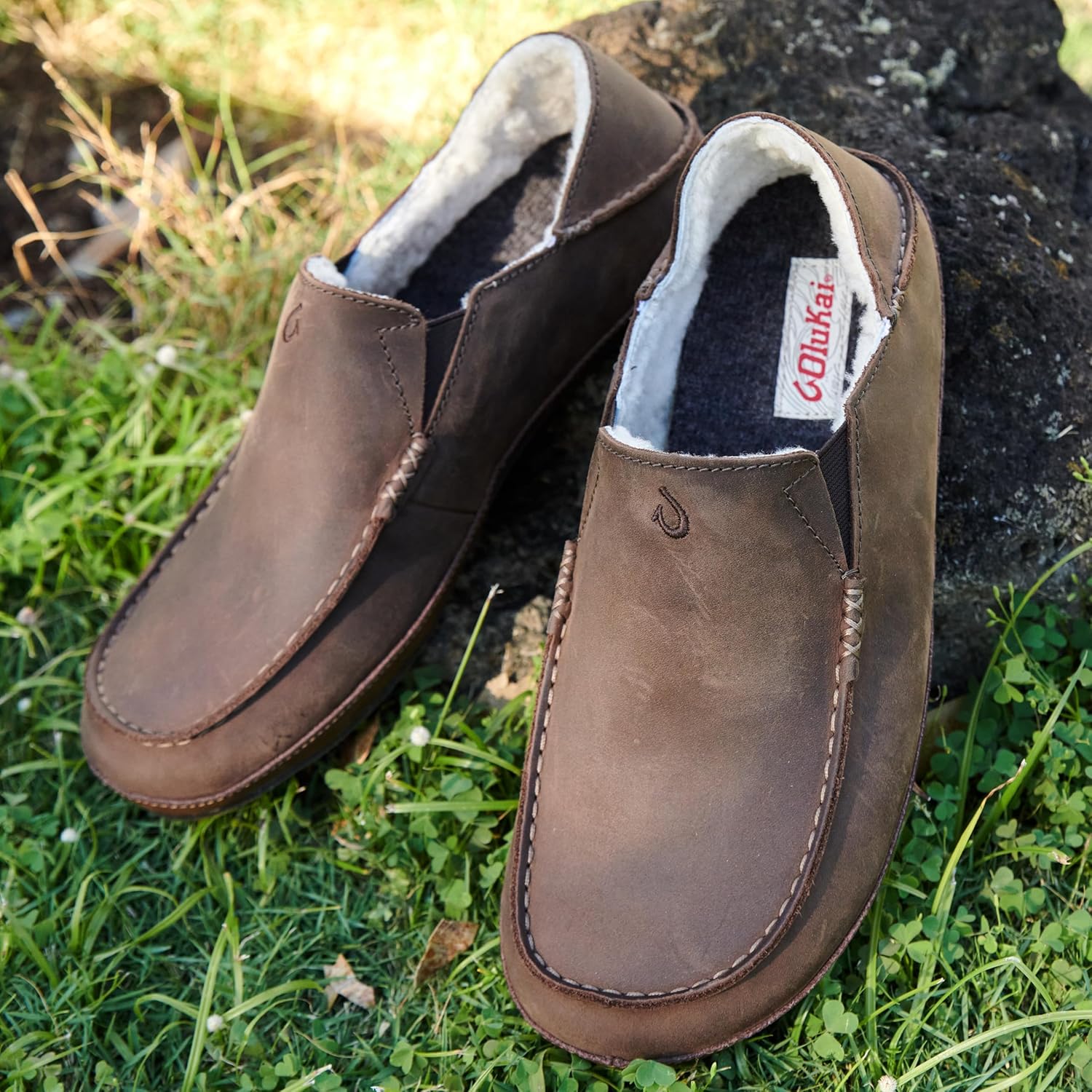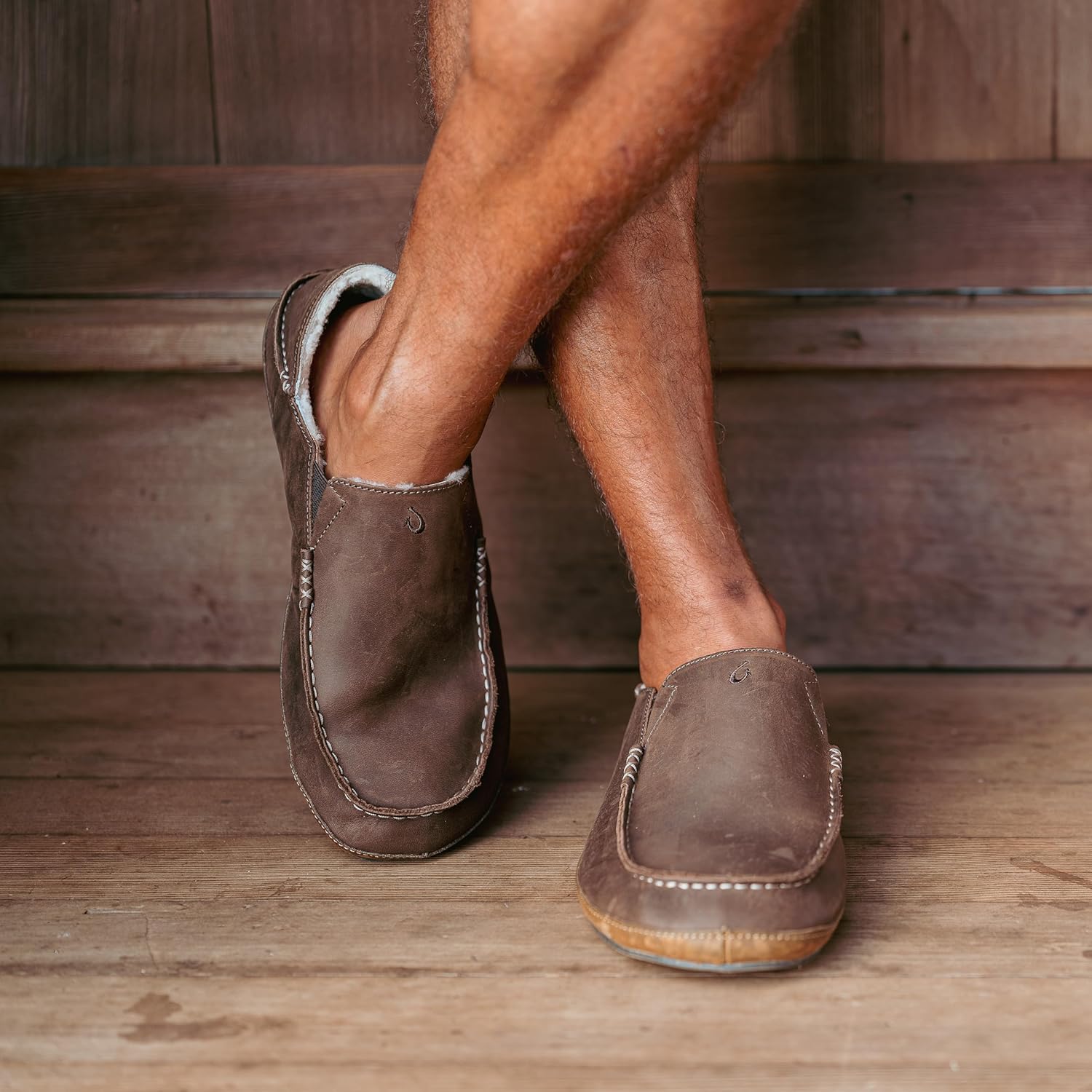 OluKai Moloa Slipper Men’s Slippers, Premium Nubuck Leather Slip On Shoes, Shearling Lining & Gel Insert, Drop-In Heel