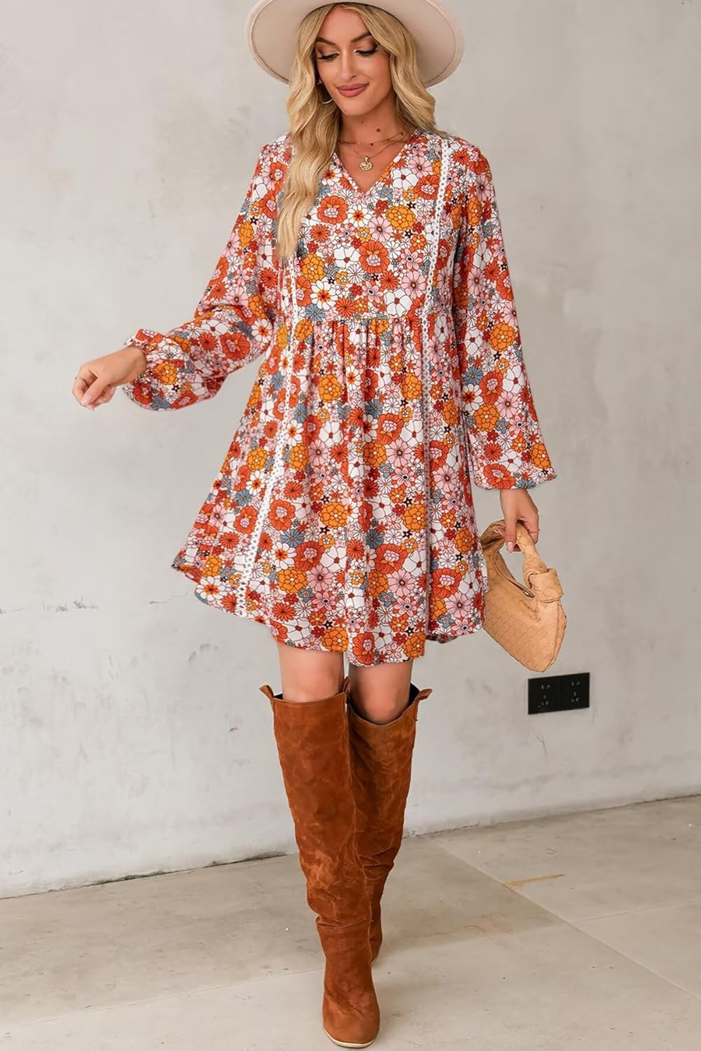 Feature:Dresses for women 2024 comes with long sleeve,V-neckline,Embroidered Lace Trim,Babydoll Dress,Empire Waist,Floral Print,A-Line Dress,Swing Flared,No Pockets,Short Mini Length,Casual Dresses fits for any body shape.