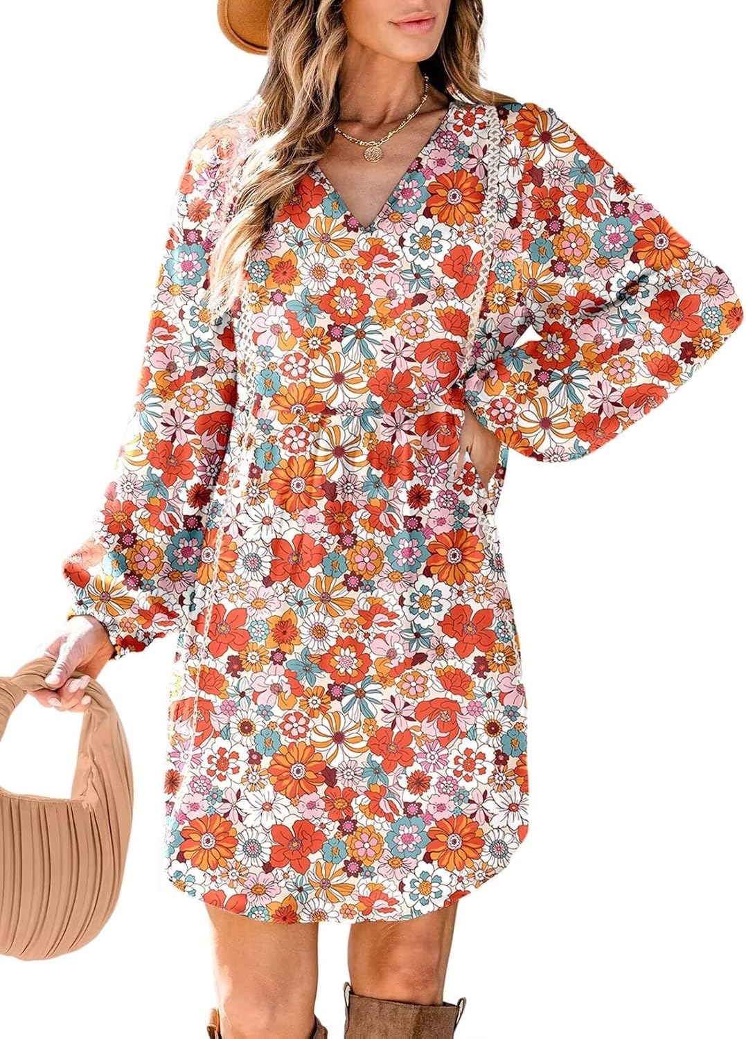 Dokotoo Women’s V Neck Floral Embroidered Lace Trim Mini Dress Long Peasant Sleeves Flowy Dress Fall Dresses