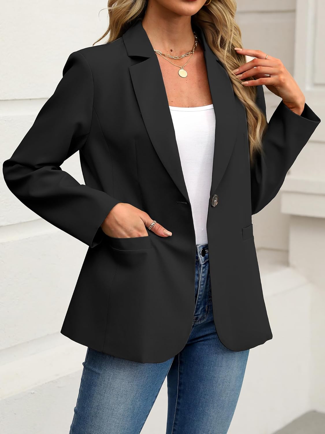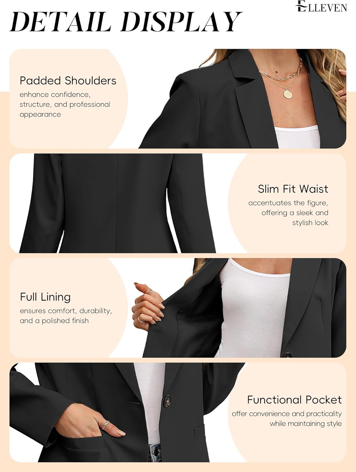Our chic ELLEVEN blazer features practical pockets and pairs effortlessly with tailored trousers or casual dresses, letting you express your unique style.