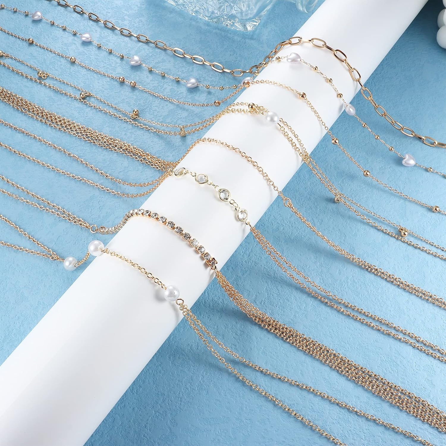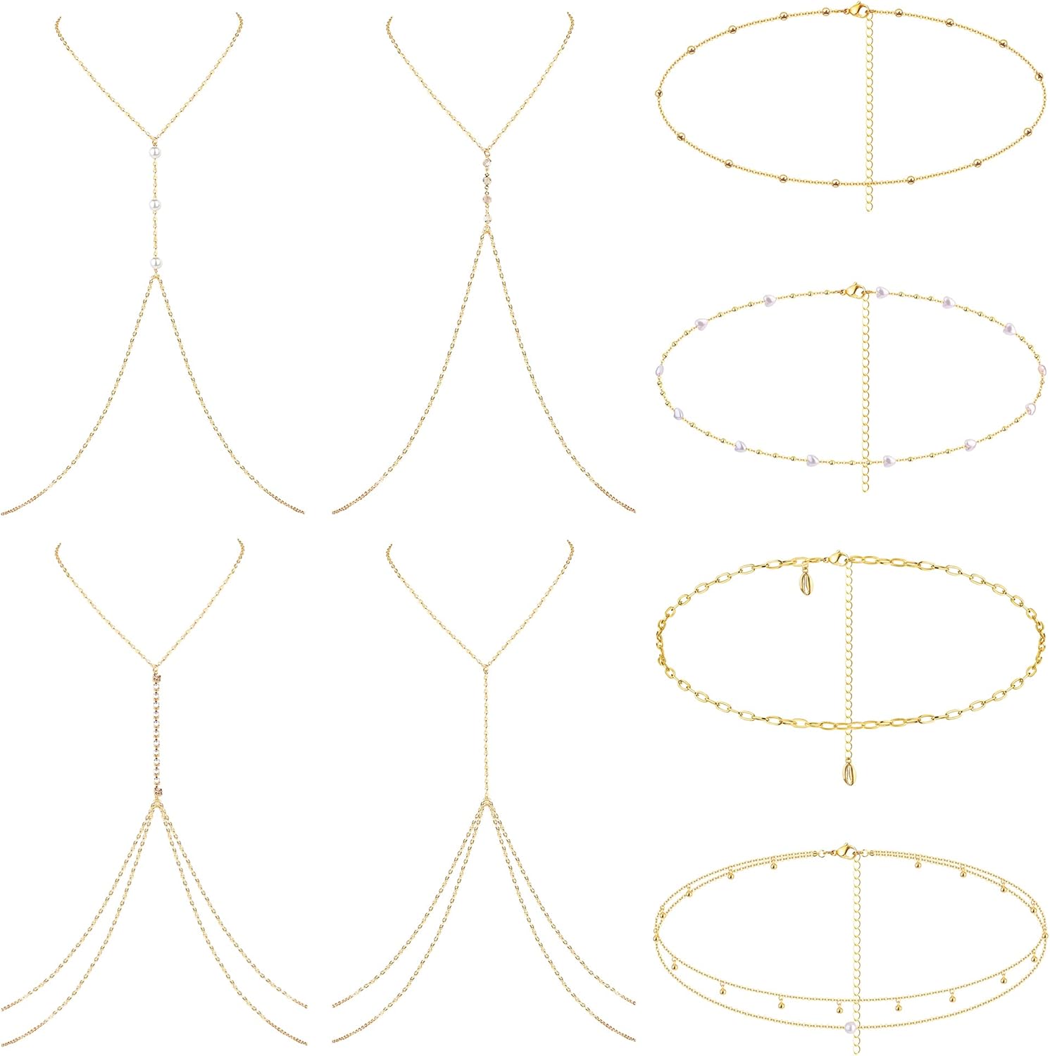 SAILIMUE 8 Pcs Body Chain Belly Chain For Women Sexy Minimalist Rhinestone Pearl Beads Waist Chain Necklace Adjustable Summer Beach Bikini Body Jewelry Gold Silver Tone