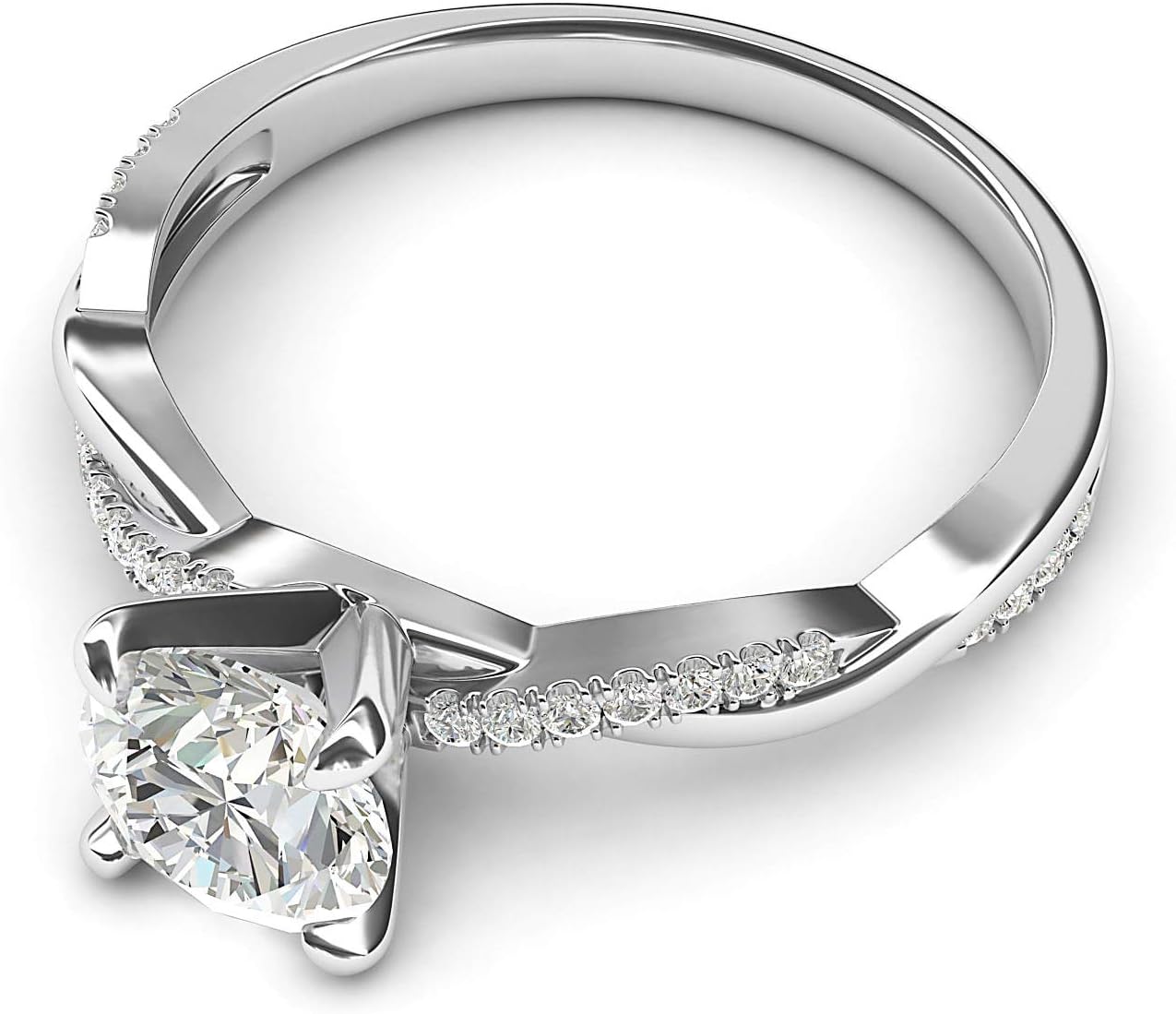 Made of real 14k white gold. Features 1 carat (6.5mm diameter, or 0.25inches) round brilliant cut clear simulated diamond in classic 4-prong setting. Accented with totally 22 round cut clear simulated diamonds in pave setting in the twisted band. Band measures 2.5mm in width.