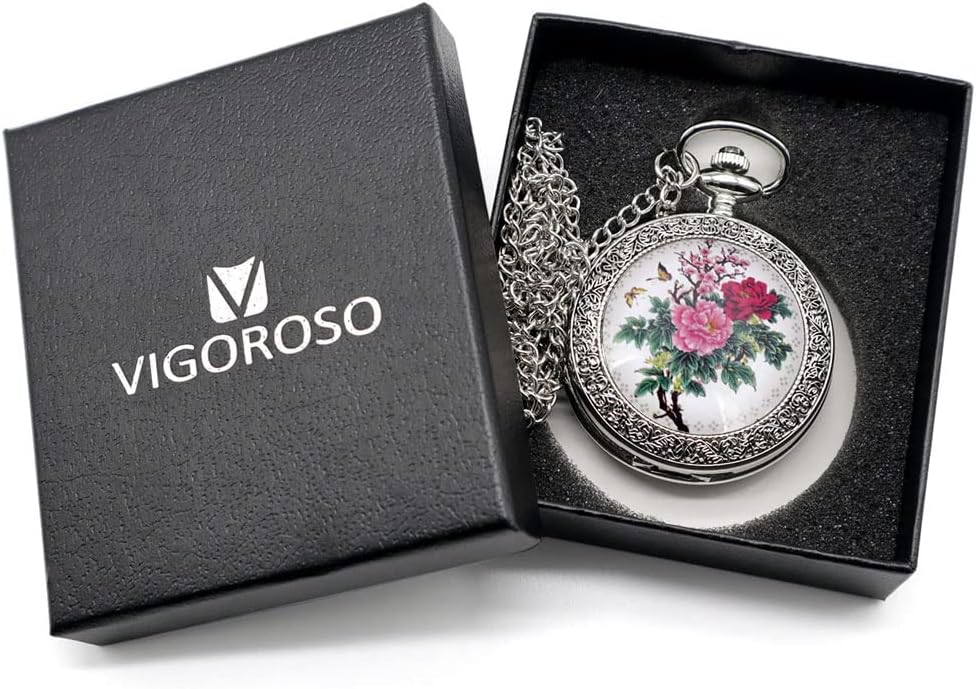 Be the first to review “VIGOROSO Quartz Beautiful Peony Bird Enamel Painting Steampunk Silver Pocket Watches in Box”