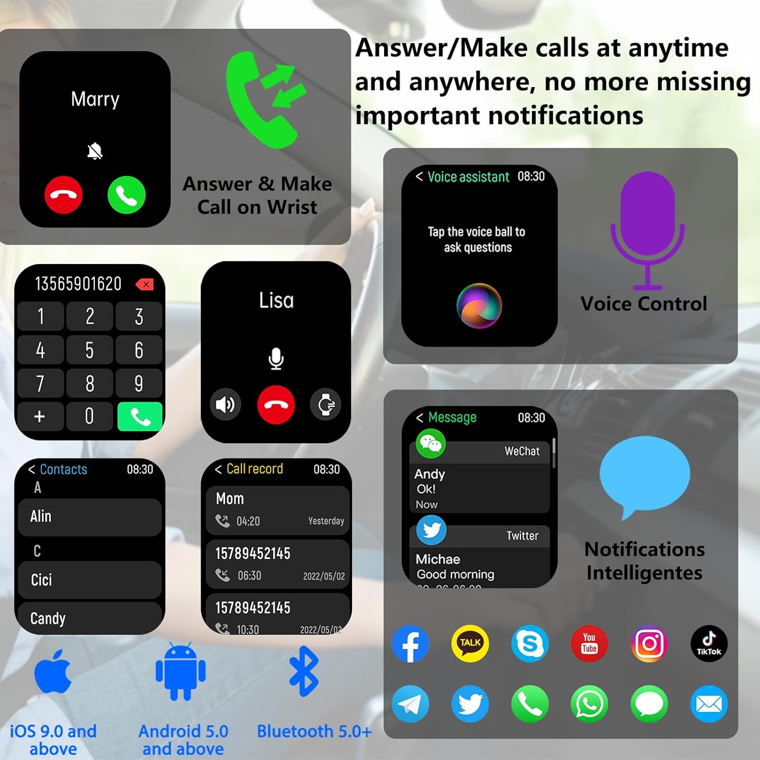Make/receive Calls & Message Reminders: This smart watch can be used to make/receive calls, add contacts, and view call records; support messages and social media notifications (Facebook, WhatsApp, Instagram, Twitter, etc.)