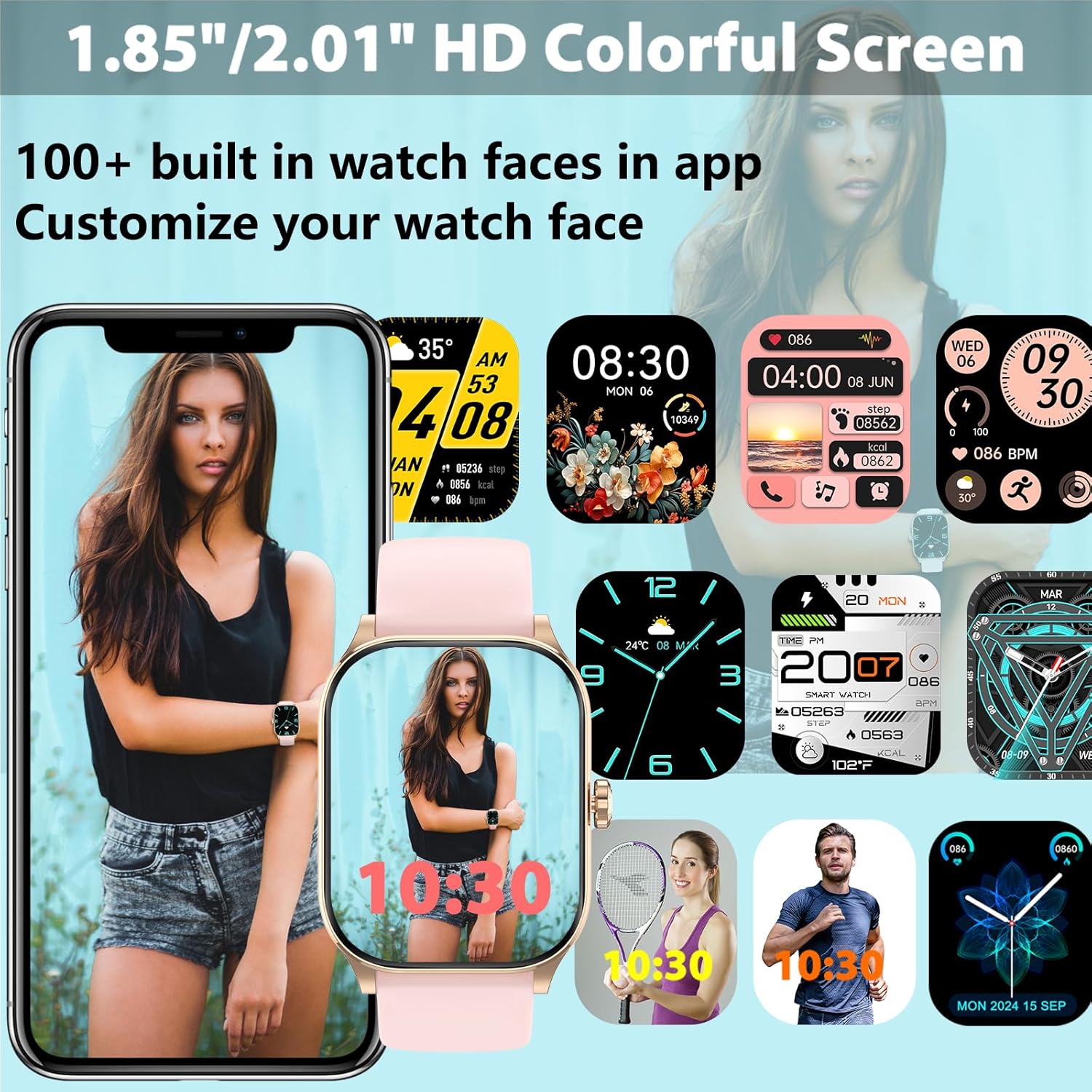 HD Screen & Custom Dial: 1.85″ HD smart watch for women and mem, 100+ different styles of dials for download and replace, also support for custom dials using photos
