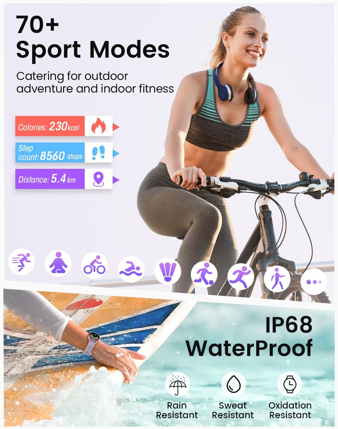 【70+ Sports Modes & Waterproof Confidence】: This smart watches for women stay active with over 70 tailored sports modes, from yoga and running to cycling and rowing. Whatever your fitness passion, this watch is by your side, even in the water with its IP68 waterproof rating. After each workout, receive detailed reports on your heart rate, steps, calories, and more, helping you reach your goals with grace and ease.