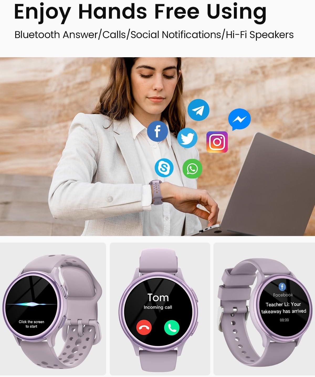 【Stay Connected All The Time】: The smart watches for women keeps you connected while keeping your hands free. Answer and make calls directly from your watch, thanks to the built-in microphone and HD speaker. Get notifications from your favorite apps like WhatsApp, Facebook, and Instagram, so you’re always in the know. Seamlessly pair with AI voice assistants for even more convenience.