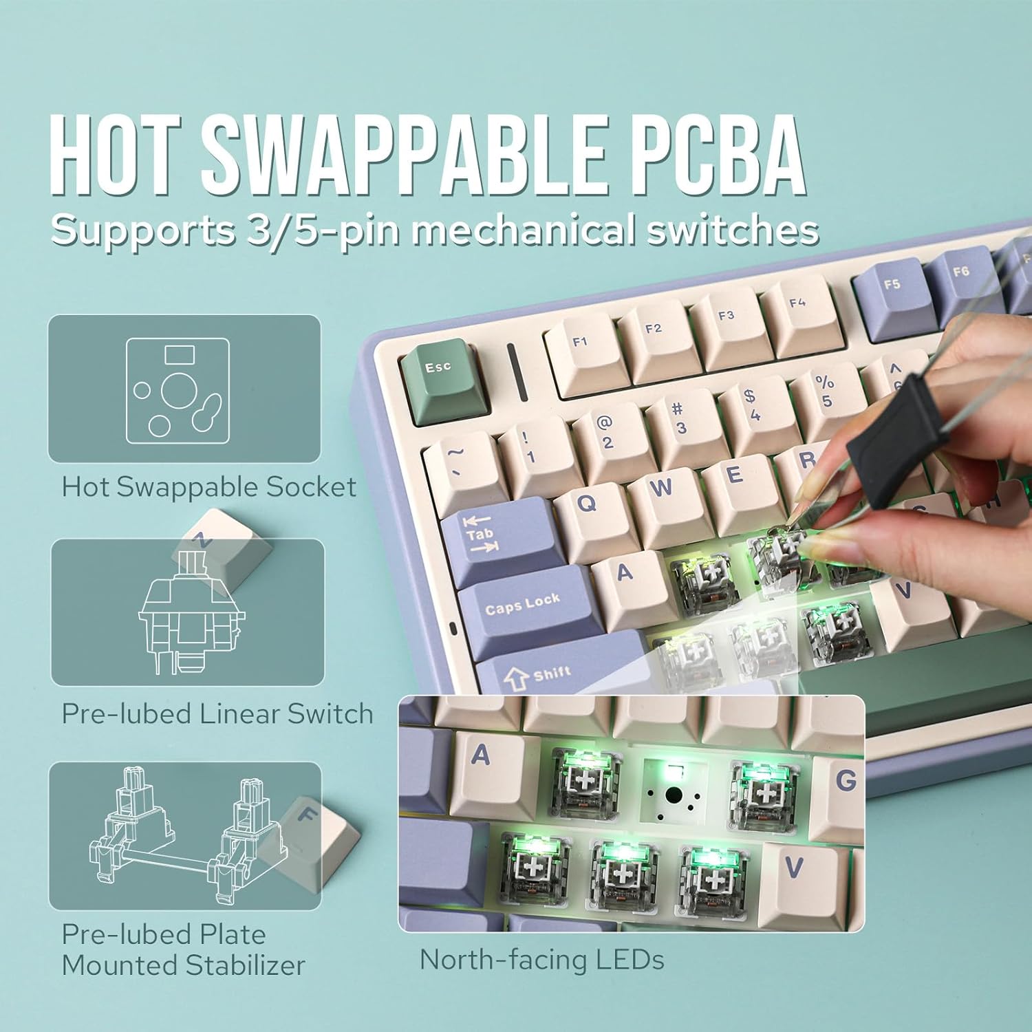 【Finely-Calibrated Stabilizers&Cherry Profile Double-shot PBT Keycaps】Discover refined keystrokes with our precision-tuned stabilizers, offering stability and a hushed typing experience. Say goodbye to key wobble as your keystrokes gain enhanced accuracy. The F75 takes durability to the next level with its Cherry-profile double-shot PBT keycaps, ensuring a perfect blend of robustness and stylish design. These keycaps stand resilient against wear, maintaining a sleek appearance that defies the test of time.