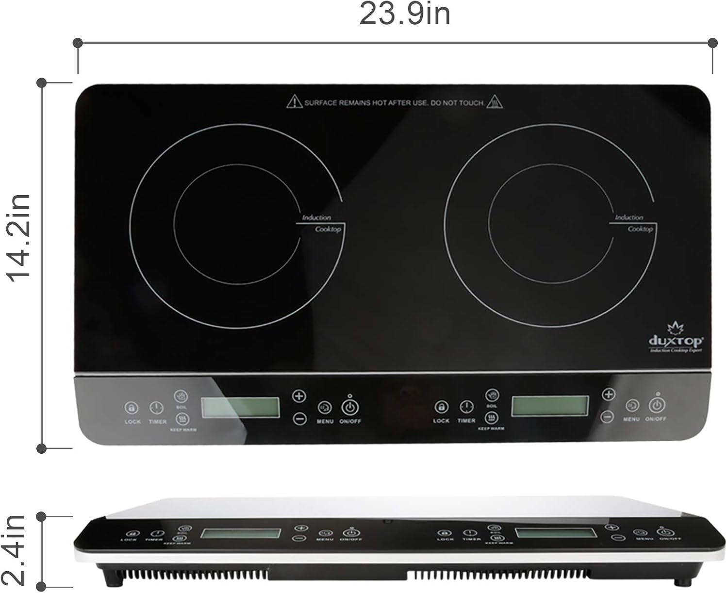 DUAL HEATING ZONES: This professional digital countertop induction cooktop by Duxtop is equipped with two independent heating zones that allow you to set each one separately using the LCD display screen