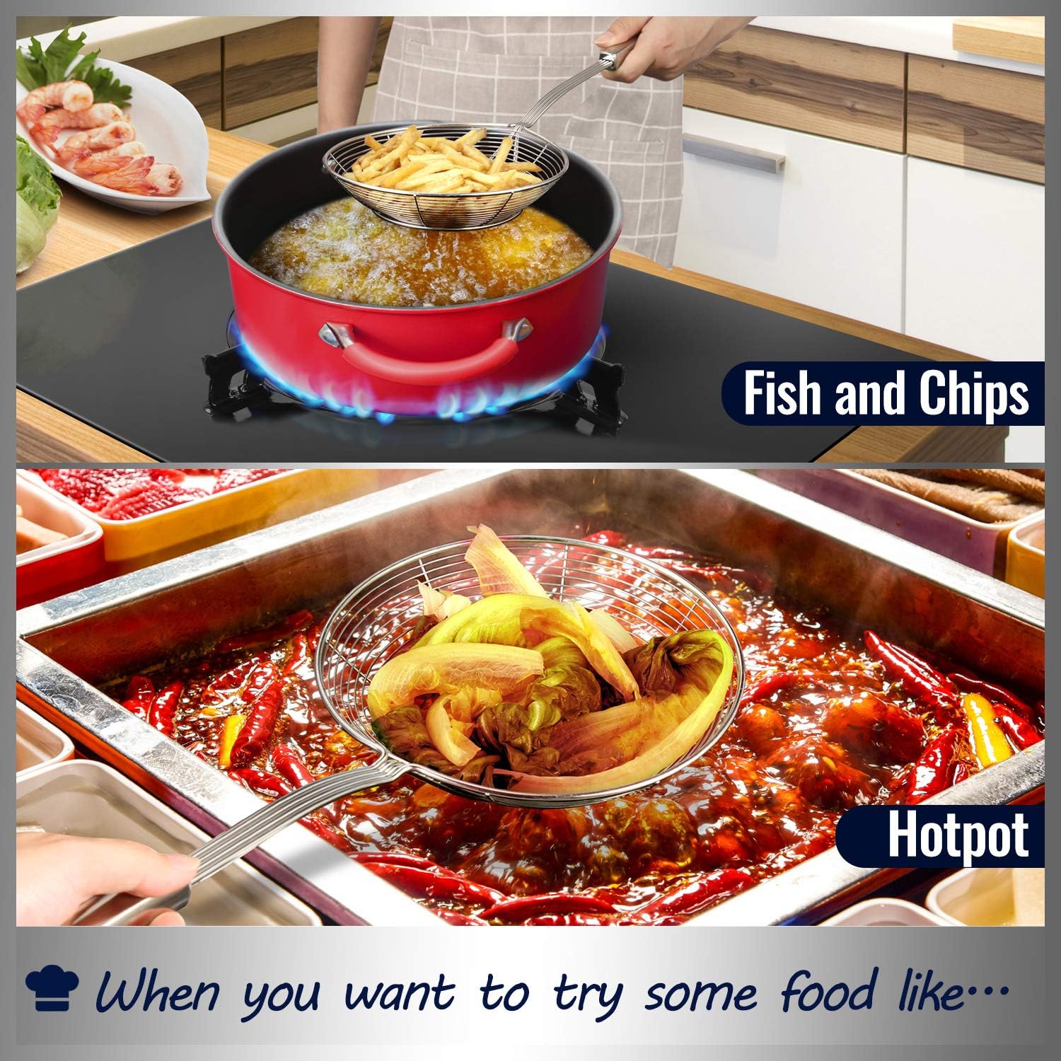 DOUBLE COIL DESIN: The unique design enhances the bearing capacity of the strainer. It is faster than a fine mesh strainer, retains the temperature but leaving little oil or water, No more need to endure high temperature, improving efficiency by quick and massive frying and cooking.