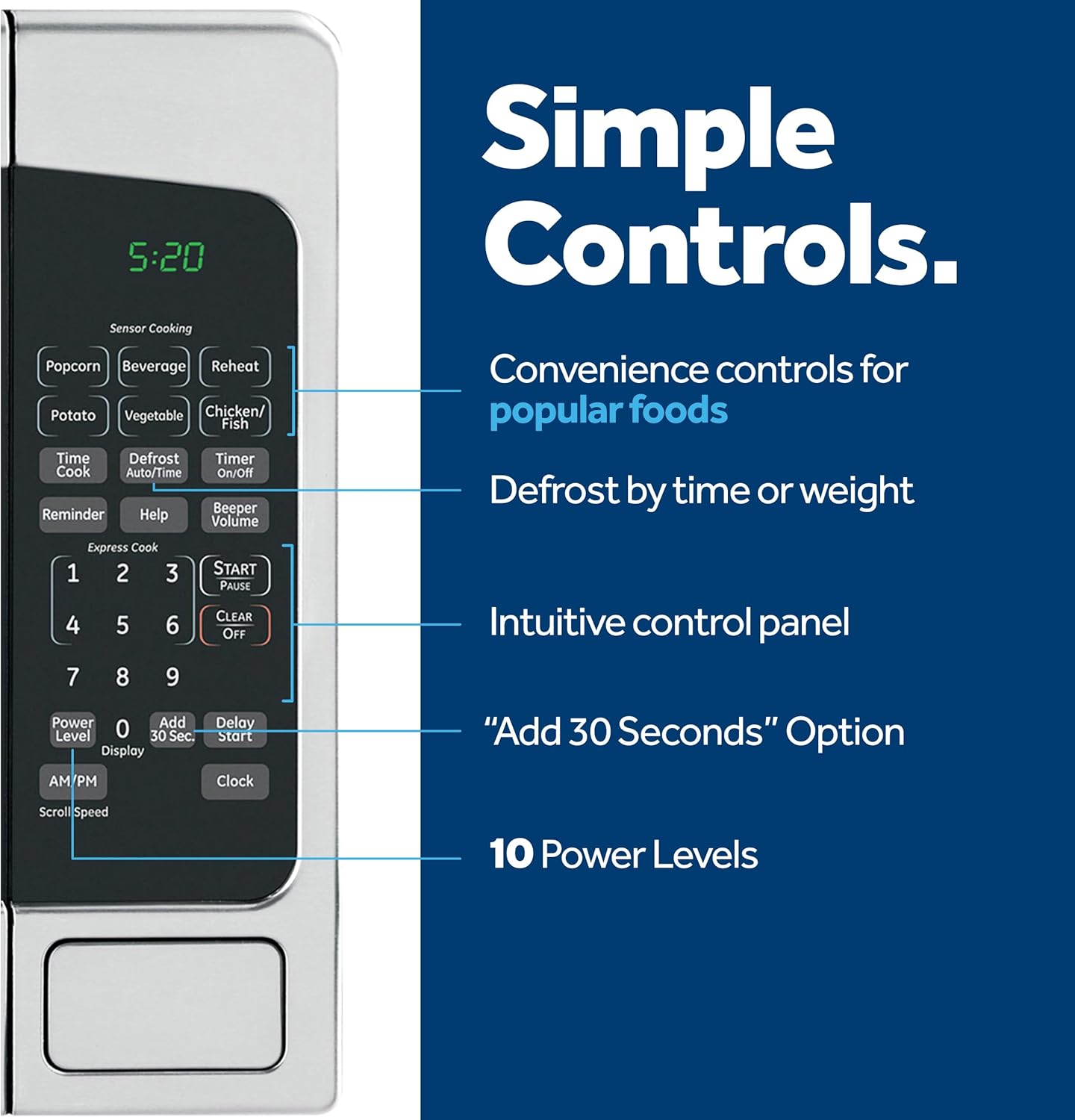 Heat leftovers and speed up cooking in your kitchen with this GE countertop microwave. Instant-on settings let you cook popcorn, vegetables and other foods with the touch of a single button, while weight and time defrost options make it easy to prepare meats for cooking. Featuring a large turntable, this GE countertop microwave delivers even, reliable heating for your dining and snacking needs.