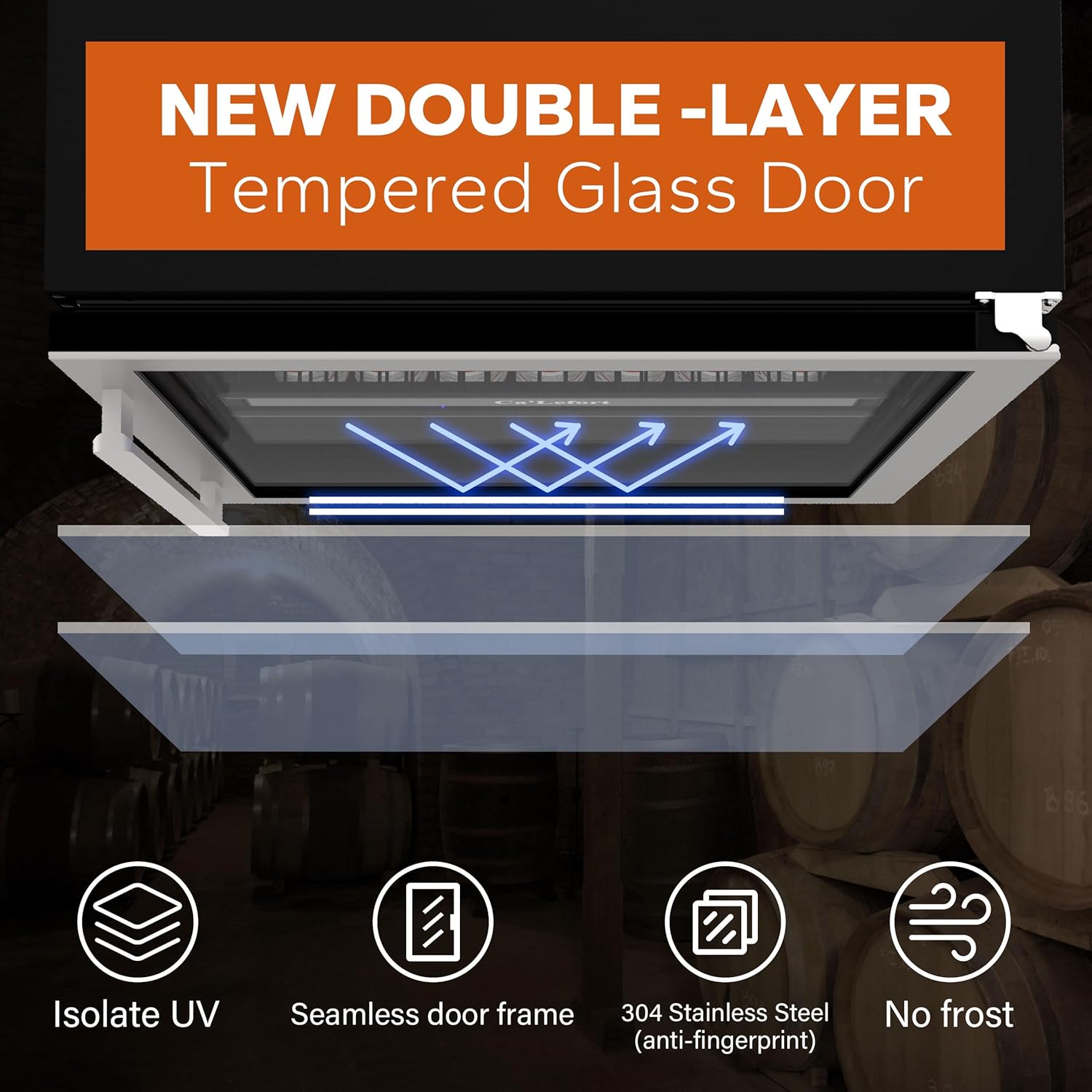 【Reversible double-glazed stainless steel door】We use double glass door with UV protection and high sealing to keep the flavor of red wine and prevent it from oxidizing. Good sealing to keep the temperature inside the refrigerator. Soft and warm light, restore the real wine cellar light environment. Brushed stainless steel door frame, effective anti-fingerprint and anti-rust. We designed hidden door hinges, so you can freely choose the door orientation according to your needs.