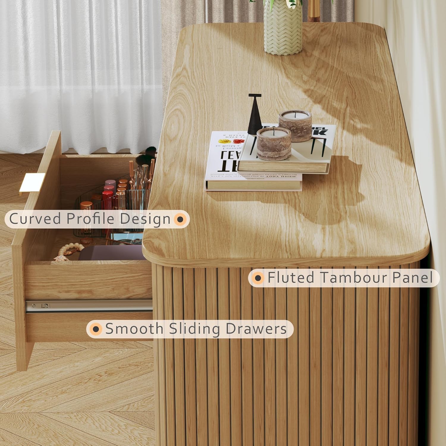 Fluted 6 Drawers Dresser for Bedroom, Mid Century Modern Closet Dresser & Chests of Drawers, Curved Profile Design, Dresser TV Stand, Wood Storage Dresser for Bedroom, Entryway, Hallway, Oak
