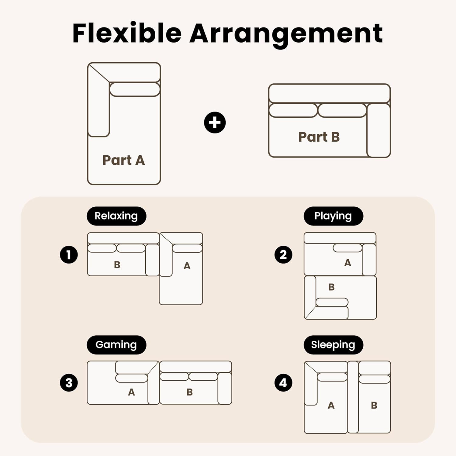 Flexible Modular Design: This modular sectional sofa features a minimalist design with versatility at its core. It’s super flexible, allowing you to customize the layout to suit your living space. Whether you choose to separate or combine the pieces, this comfy couch adapts to your needs in various scenarios, including relaxing, sleeping, gaming, or watching TV