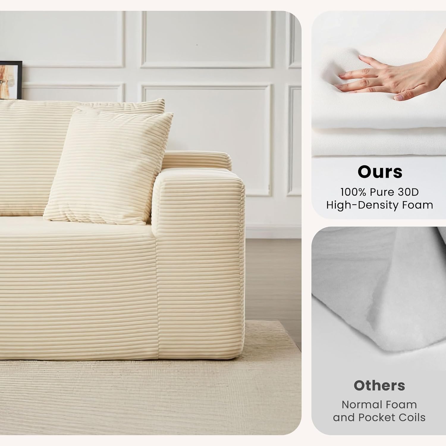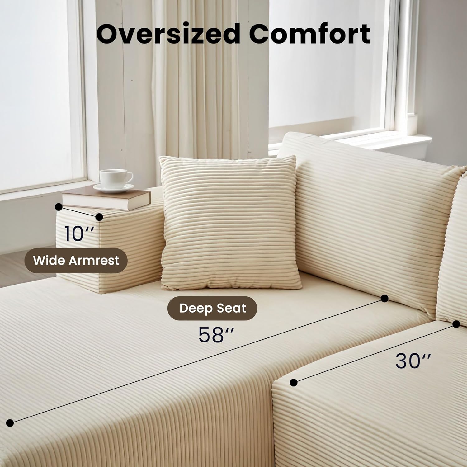 Comfy Chaise: Sink into comfort with deep, spacious seats and wide armrests, crafted with 100% pure 30D high-density foam for support and relaxation. Whether you’re lounging, reading, or watching TV, this corduroy couch provides a cozy spot to unwind with a cloud-like feel