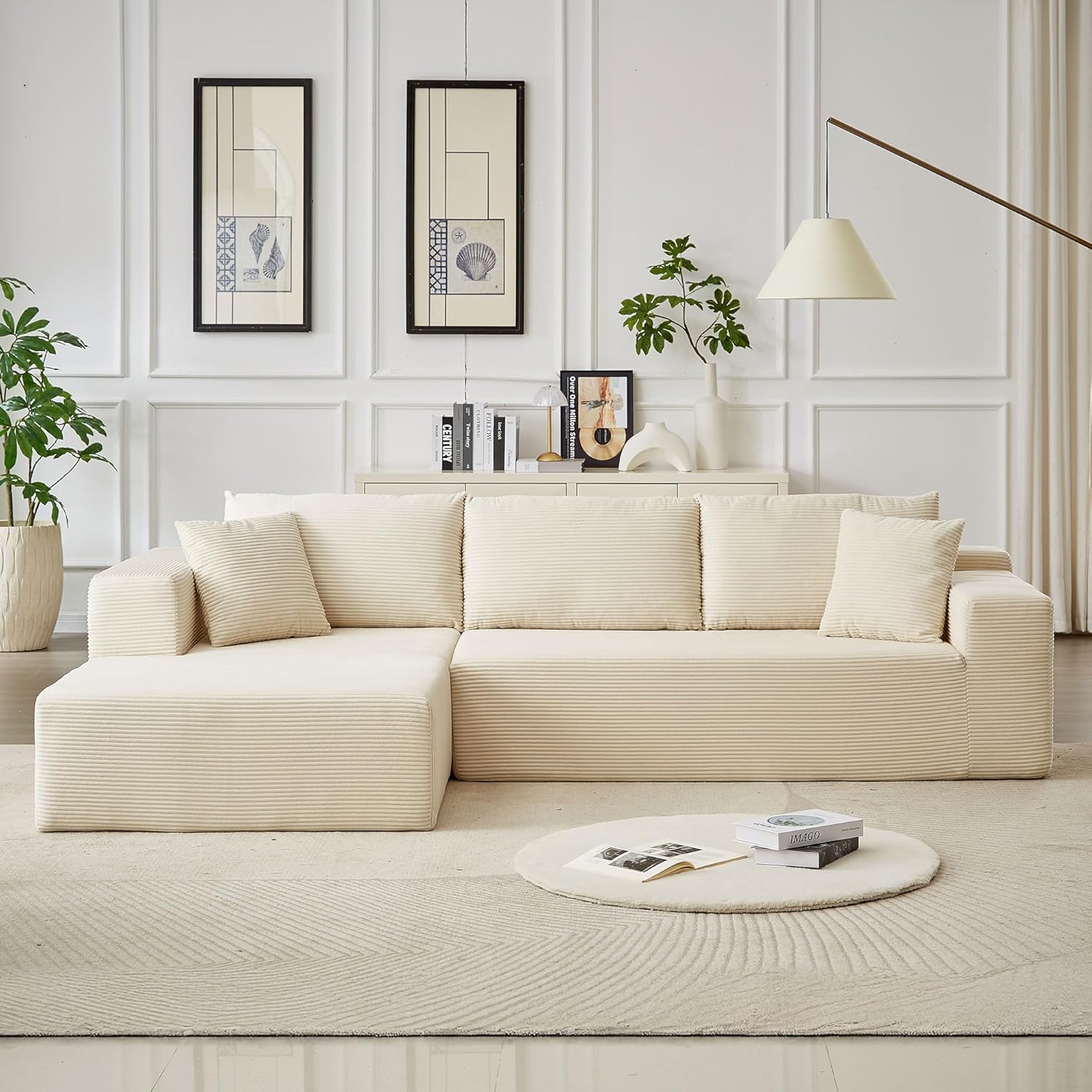 109″ Minimalist Modular Sectional Sofa – L Shaped Couch with Chaise Comfy, Deep Seat, Wide Armrest, for Living Room, No Assembly Required, Warm Beige Corduroy