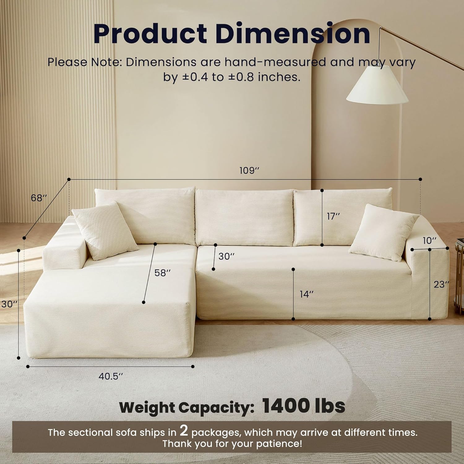 Say goodbye to the hassle of furniture assembly! Simply unpack the pieces, gently pat them to enhance their springiness, and within 72 hours, your sectional couch will be perfectly fluffed. Enjoy the ease of unpacking and watch your comfy couch transform! For ease of transport and moving, it ships in two separate packages, which may arrive on different days