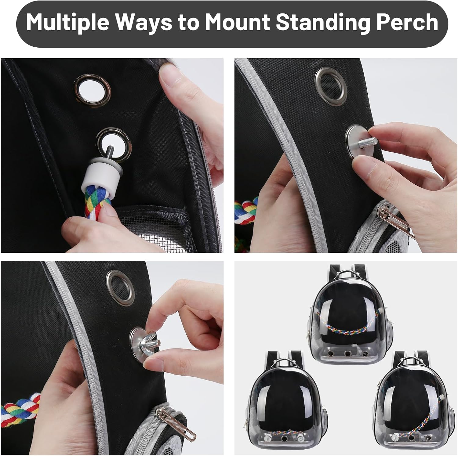Multi-functional & Fully Equipped: The bird perch can be disassembled and the pet travel backpack also can be used to take cats, dogs, rabbits, mice, lizards, hedgehogs and other small pets. Package includes 1* Bird Backpack; 1 *Soft Mat; 1 *Standing Perch; 1 *Bird Birdseed & Water Cups; 1 *Stainless Steel Tray; 1 *Bird Toy