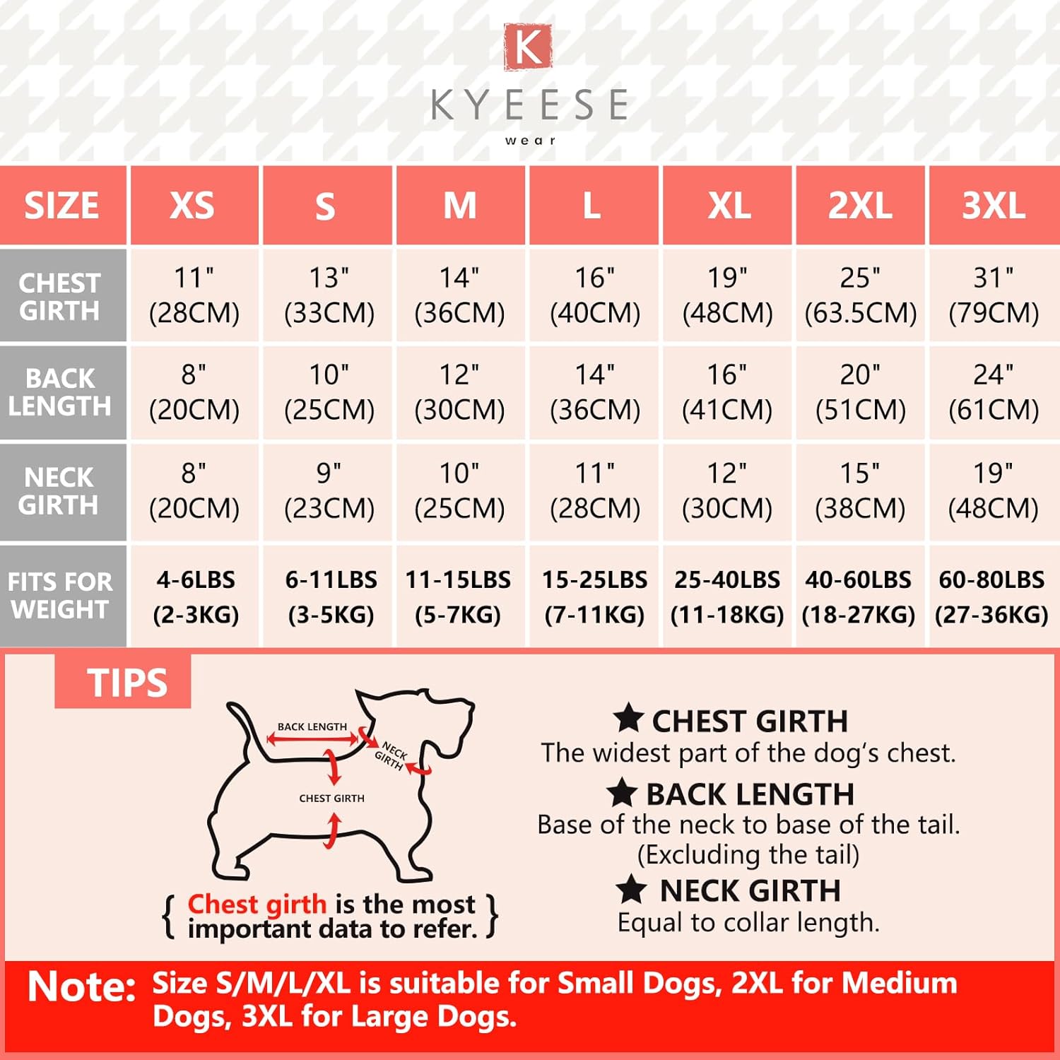 Sizing Note: Please don’t choose the size based on your usual size, measure your pet’s chest girth in priority, and back length, get the right size based on KYEESE size chart. If your pet is still growing, or your pet has a stout body, please do size up