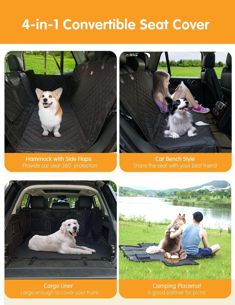 4 Ways to use: NZONPET car seat cover can easily convertible between dog hammock, bench car seat cover protector, cargo liner or camping placemat up or down.