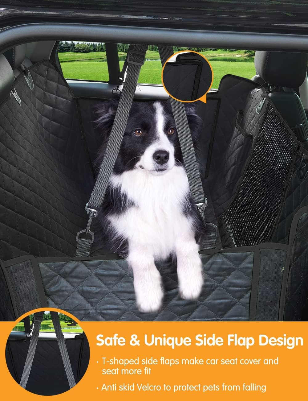 Safe for Your Dog: 1 Pet Safety Belts, 4 Seat Belt Opening, 2 Seat Anchors, Anti-skid design on the bottom, 2 side flaps straps and 4 Adjustable headrest straps provide multi-protection and let car seat cover stay in place, making doggie feel right at home.