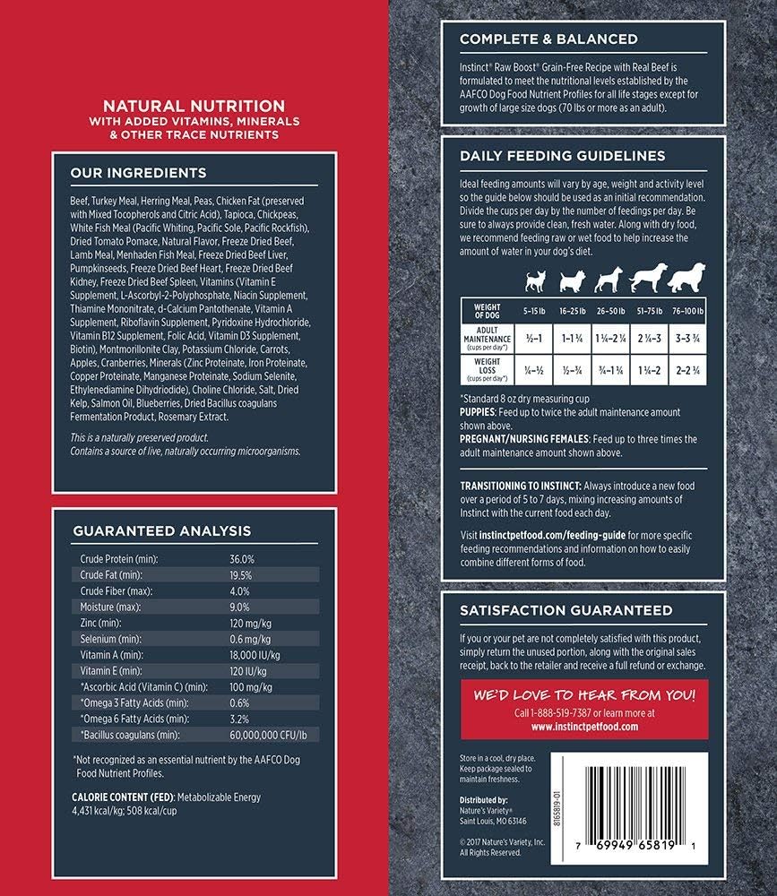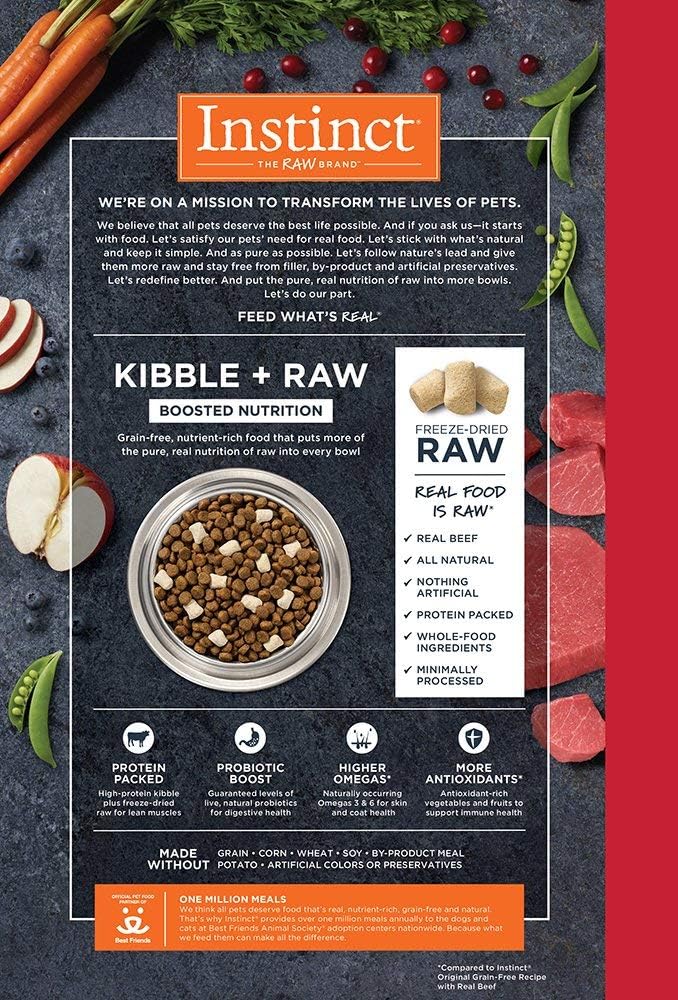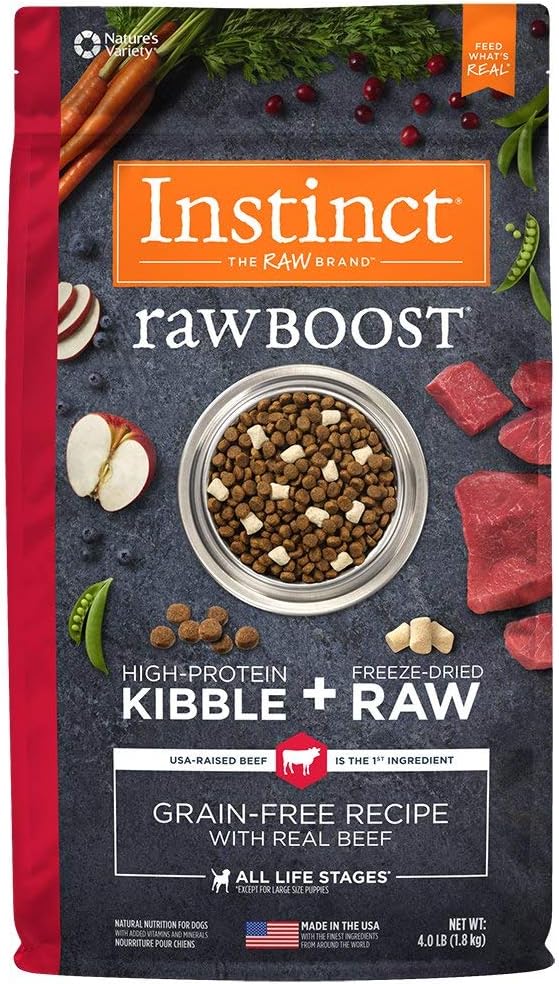 GRAIN FREE DOG FOOD WITH FREEZE DRIED RAW USA RAISED BEEF: Instinct Raw Boost natural dry dog food combines high protein, grain free kibble with all natural bites of freeze dried raw beef. USA raised beef is the #1 ingredient.