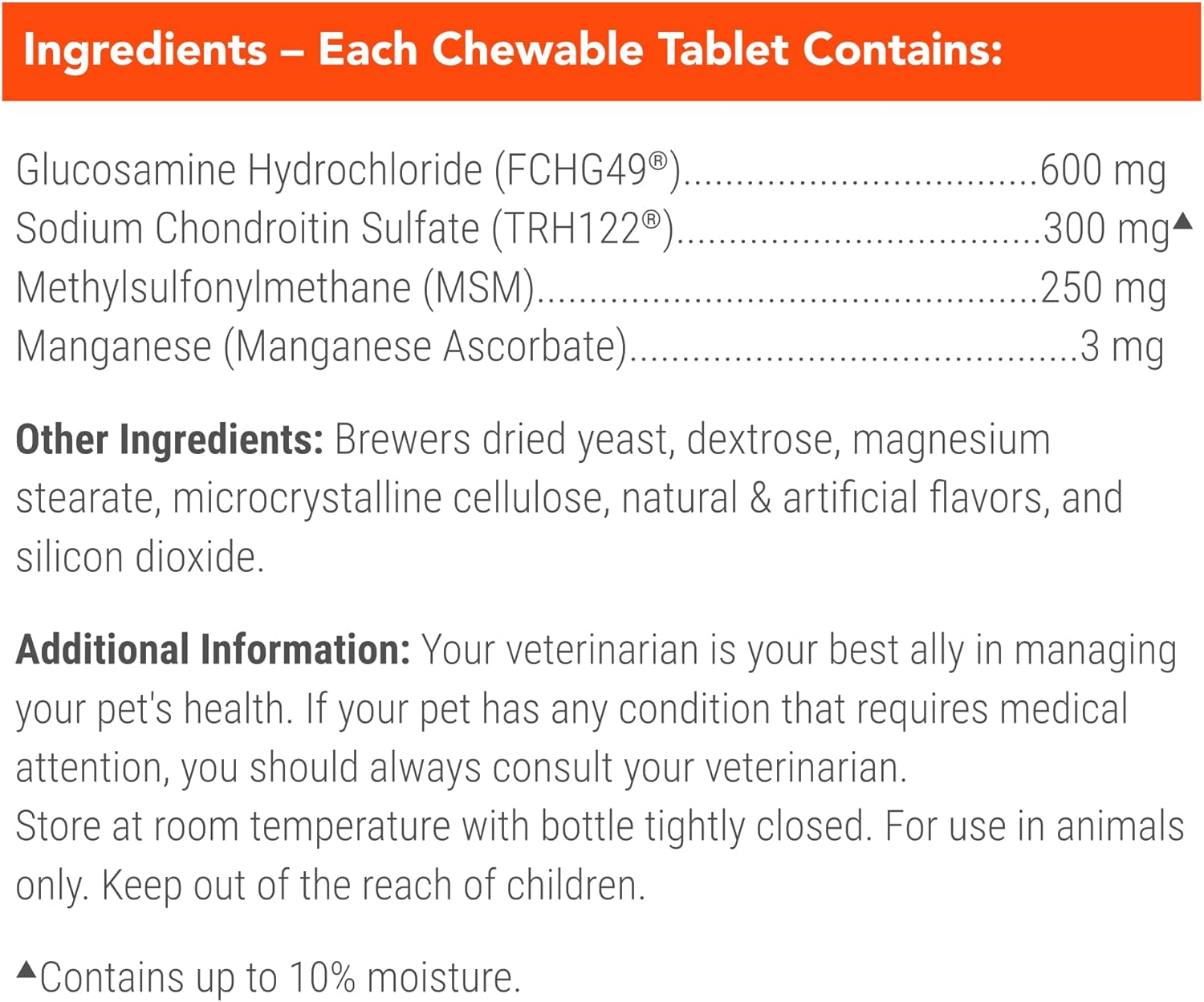 Cosequin Maximum Strength Plus MSM contains glucosamine hydrochloride, sodium chondroitin sulfate, and methylsulfonylmethane (MSM). This combination of ingredients help support healthy cartilage. Cosequin joint health supplements are brought to you by Nutramax Laboratories Veterinary Sciences, the #1 veterinarian recommended supplement company. ▼Source: Among retail brands. Survey conducted among small animal veterinarians who recommended oral joint health supplements. *Source: Survey conducted among small animal veterinarians who recommended animal supplements.