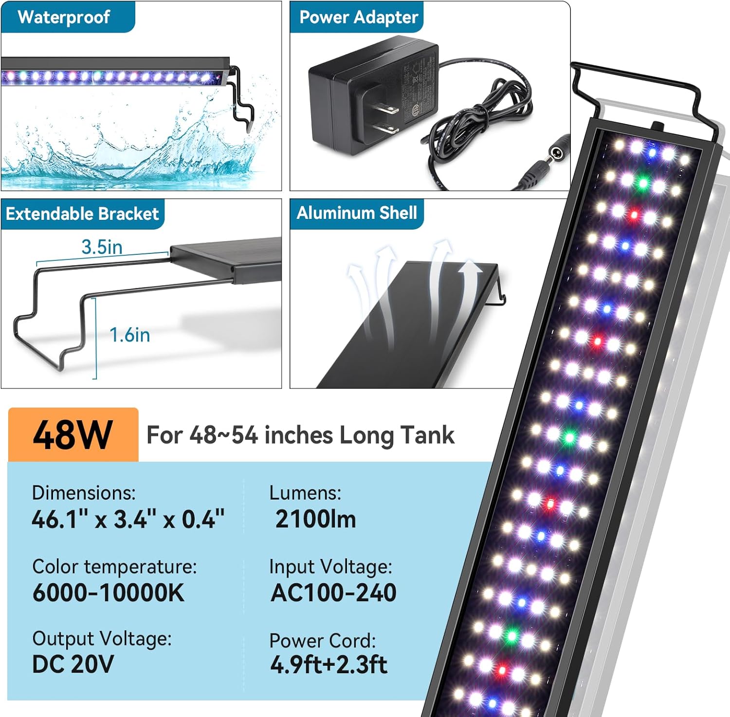 【Ultra-bright & High CRI】This 48 watt full spectrum light contains three row 2835 LED bulbs and two row 5054 WRGB bulbs with an illumination of 2700 lumens to adequately lit the aquarium, which gives a visual display of vibrant colors for your fish and plants. Ideal for use in aquatic plants and freshwater aquariums.