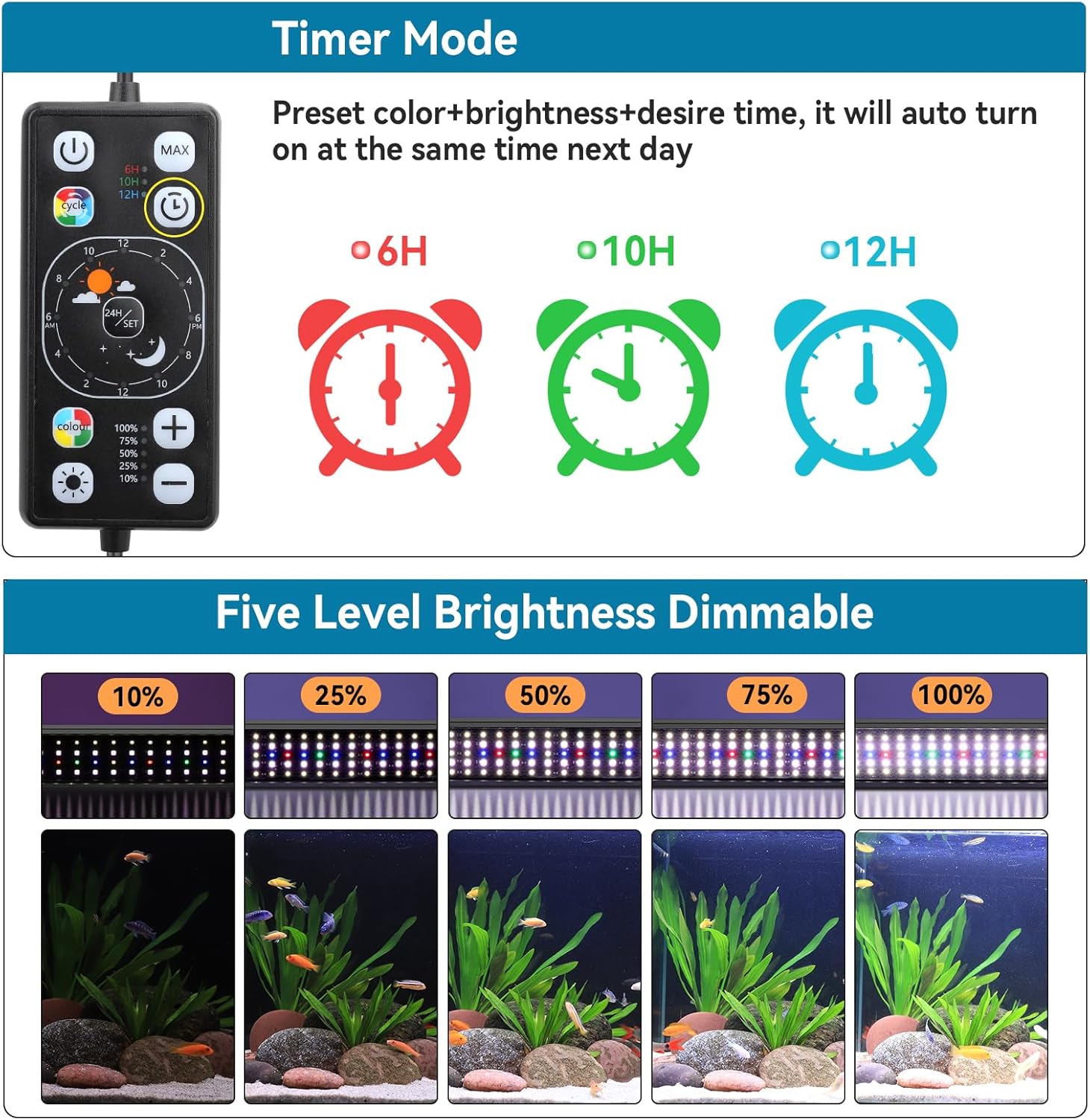 【Upgrade Day-Night Cycle Mode】24/7 mode lets you have the option of selecting a custom schedule with 24-hour automatic gradual of sunrise, sunlight, sunset, and night providing your aquarium with vivid and natural color performance. That allows you to set in 2-hour increments to choose the time of turn on and off, which you can get a min of 2 hours or up to 24 hours of lighting time.