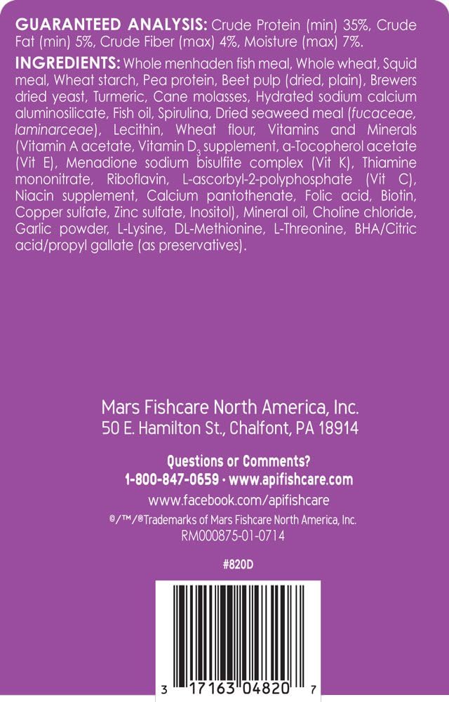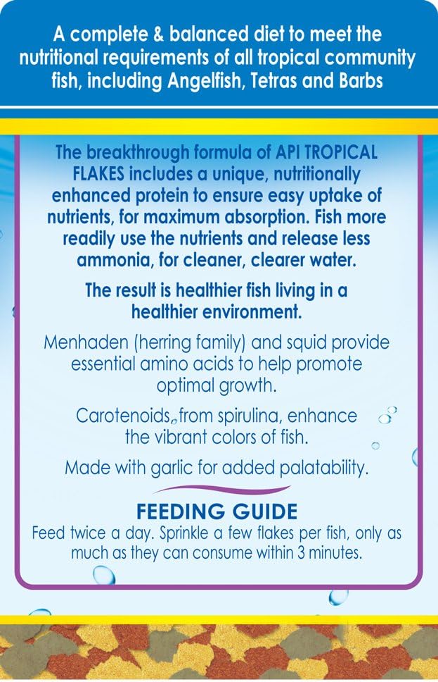 Feed your tropical fish a protein-rich diet scientifically formulated to promote healthy growth and cleaner, clearer water with API TROPICAL FLAKES Optimal Protein Fish Food. Overfeeding, low palatability and low quality lead to unconsumed or poorly digested food which causes waste and raises ammonia levels. High levels of ammonia are toxic to fish and can cause gill damage, stress, illness and death. API TROPICAL FLAKES Optimal Protein Fish Food is a complete and balanced diet ideal for all types of tropical fish including Tetras, Angelfish, Discus, Barbs and Guppies. API Fish Food contains nutritionally-enhanced protein for maximum digestion and produce up to 30% less ammonia. The more nutrients your fish digests, the less waste and ammonia are released, leaving cleaner, clearer water. Plus, they contain menhaden and squid for optimal growth and carotenoids to enhance color. Feed twice a day, and provide only as much as your fish will eat within three minutes. API Fish Food is formulated for a variety of popular fish such as cichlids, goldfish, tetra, betta, angelfish and more with high quality ingredients fish love such as algae, shrimp, worms and more. Keep your fish healthy, happy and colorful with food that contains optimal levels of nutrients as well as helps produce less waste, toxins and stress. For delayed release try API VACATION and WEEKEND PYRAMID FEEDERS.