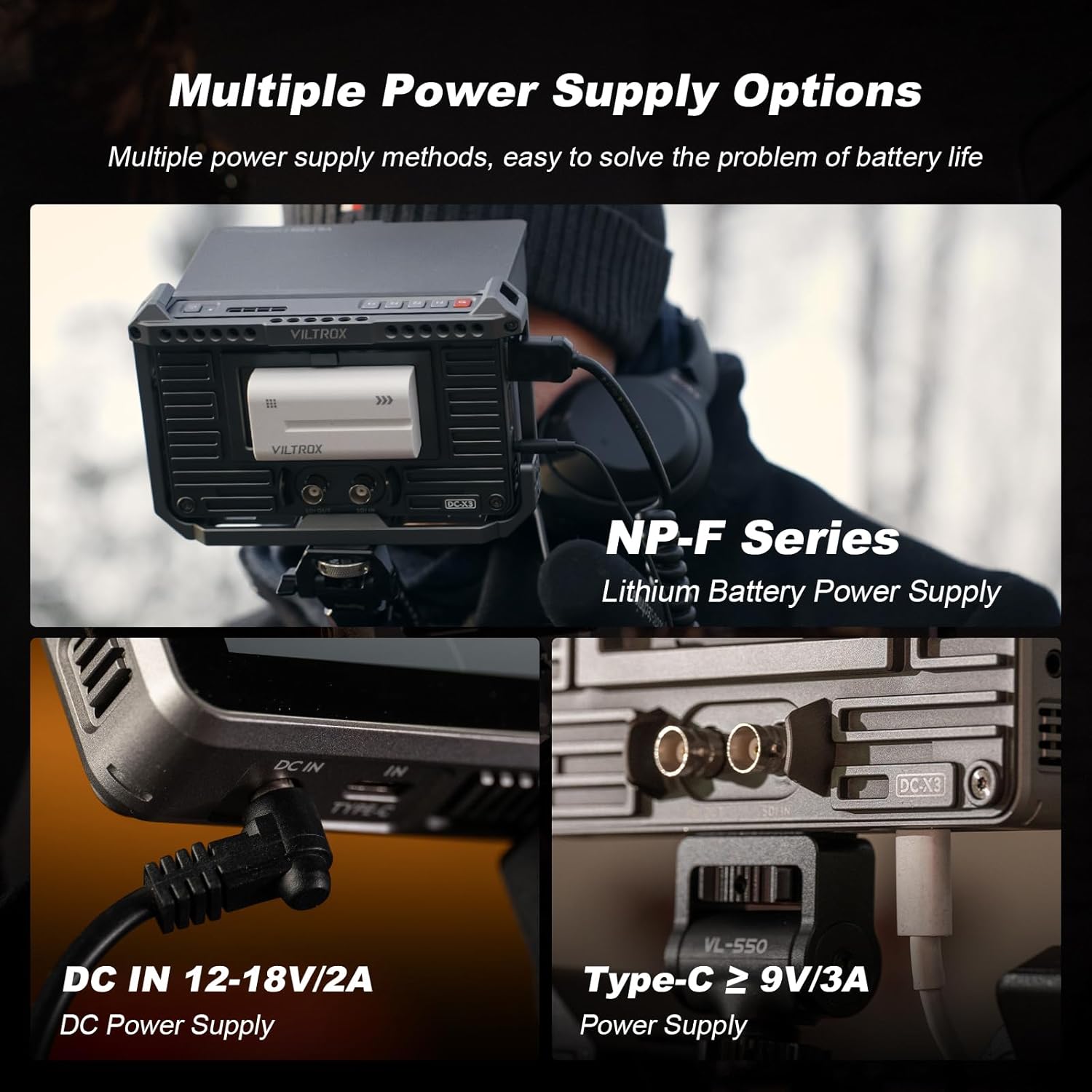 ❤【MULTIPLE POWER SUPPLY,LONG-LASTING BATTERY LIFE】Dc-x3 dslr camera field monitors support lithium battery,type-c,dc power supply multiple ways of power supply,easily solve the problem of battery life,to ensure touchscreen camera monitor 4k viltrox dc x2 monitors can continue to work in a variety of environments,to meet the needs of long-time shooting,so that the monitor is more durable.