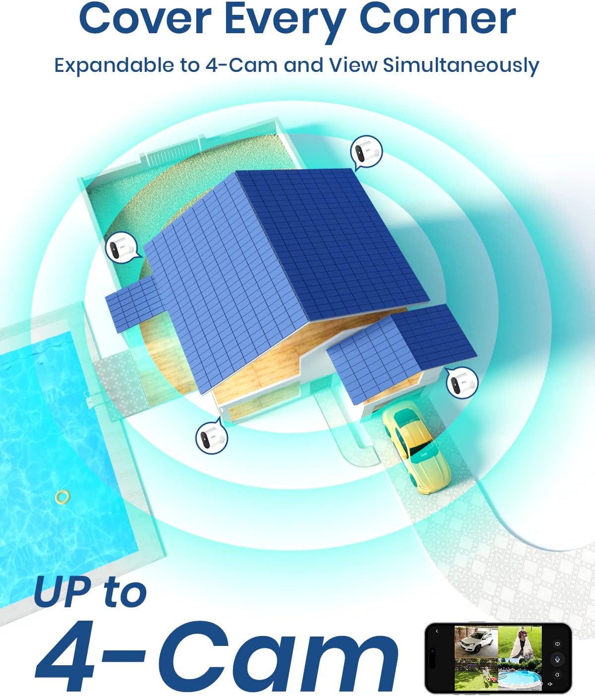 Camera Addable – Up to 4pcs cameras can be connected to the homebase, you can add camera(same model) whenever you need. Live view multiple areas at the same time on one screen to implement a wireless security camera system.